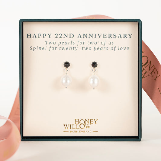 22nd Anniversary Gift - Black Spinel & Pearl Earrings - Silver & Gold