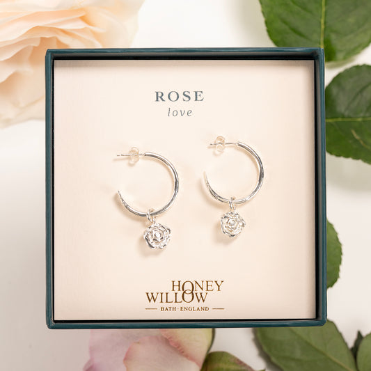 Rose Flower Hoop Earrings - Love - Silver - 2cm