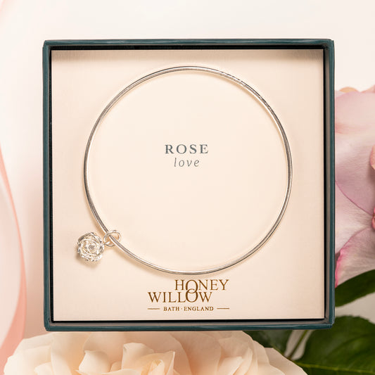 Personalised Rose Flower Open Cuff Bangle - Love - Silver