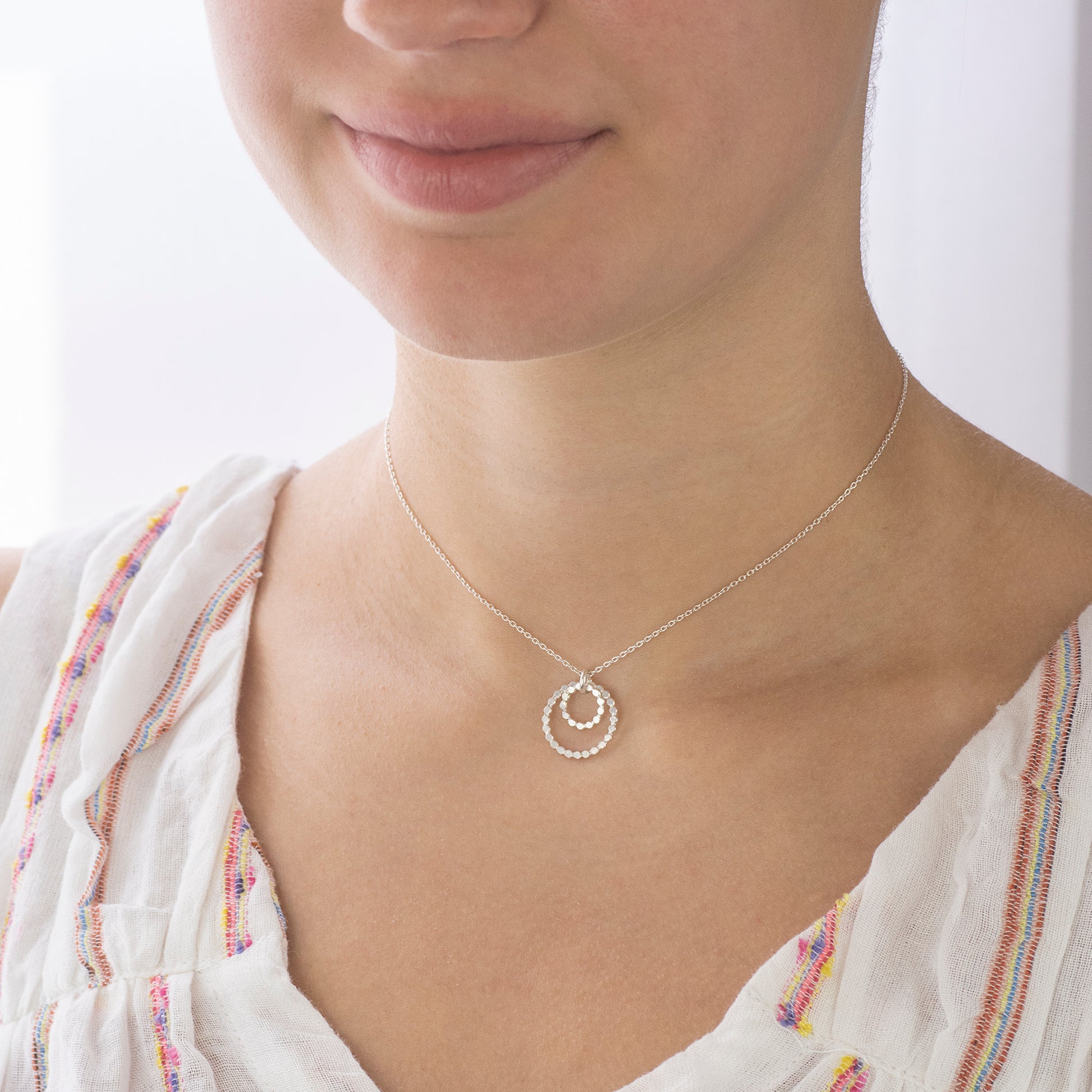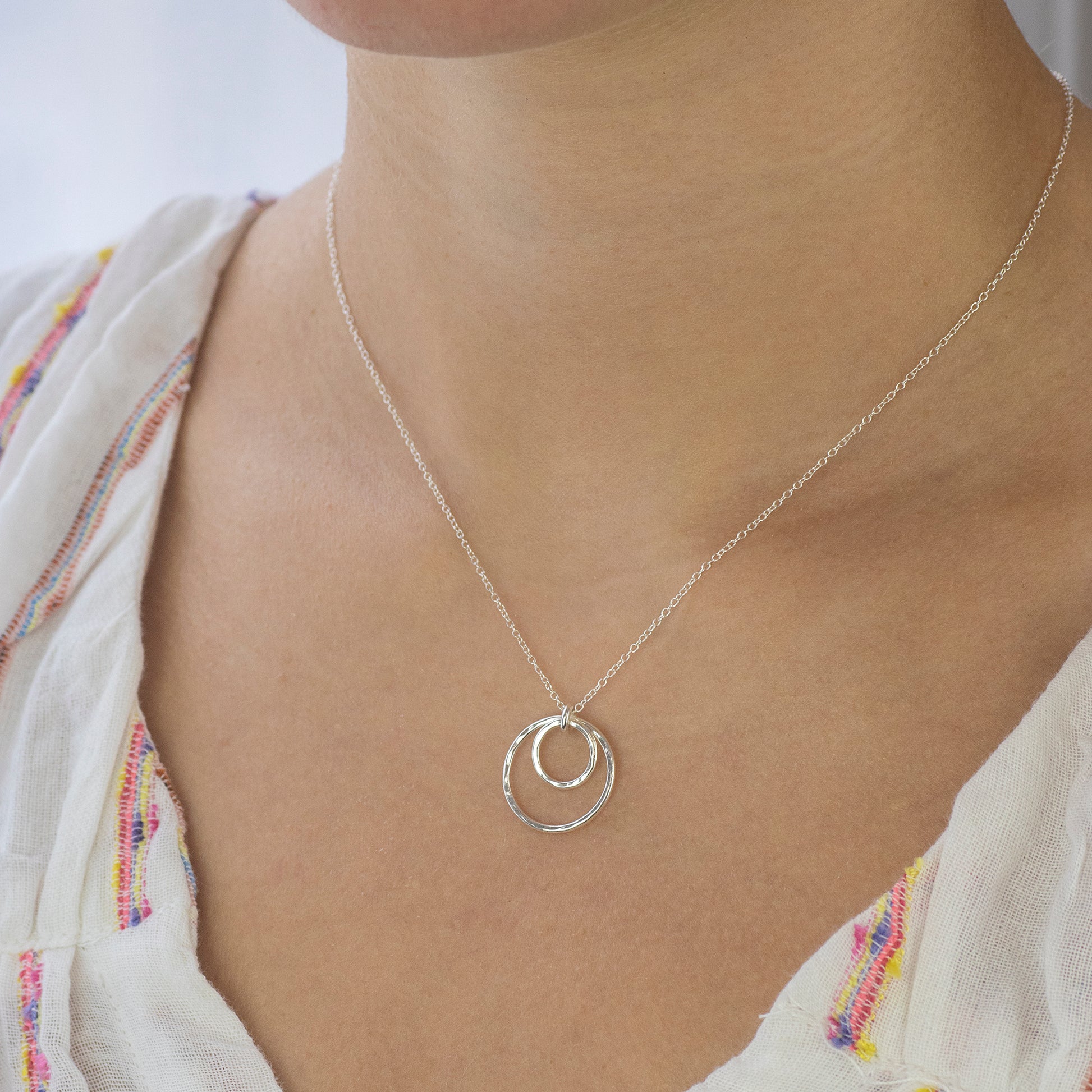 This double circle necklace is handmade with either hammered silver, beaded silver or 18k gold plating over silver.