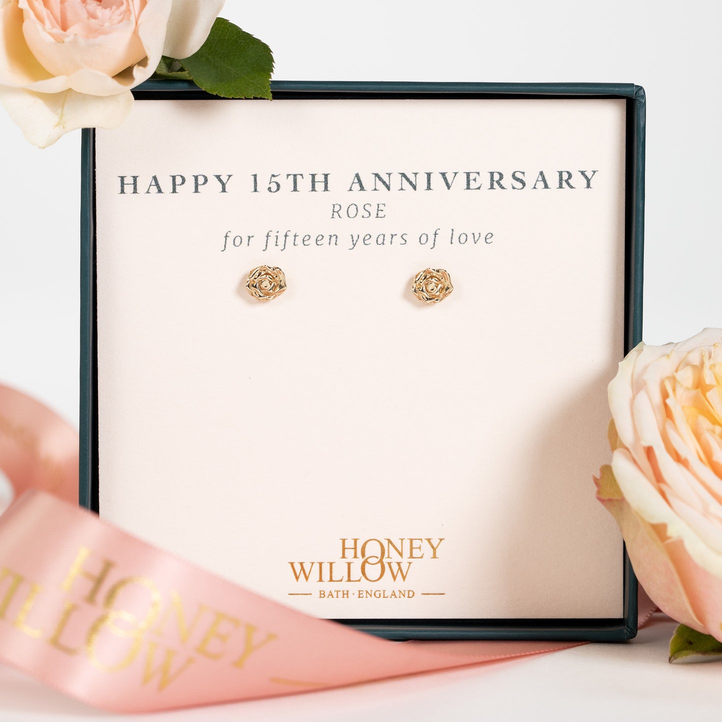 Celebrate her 15th anniversary with rose flower stud earrings made with 9kt gold.