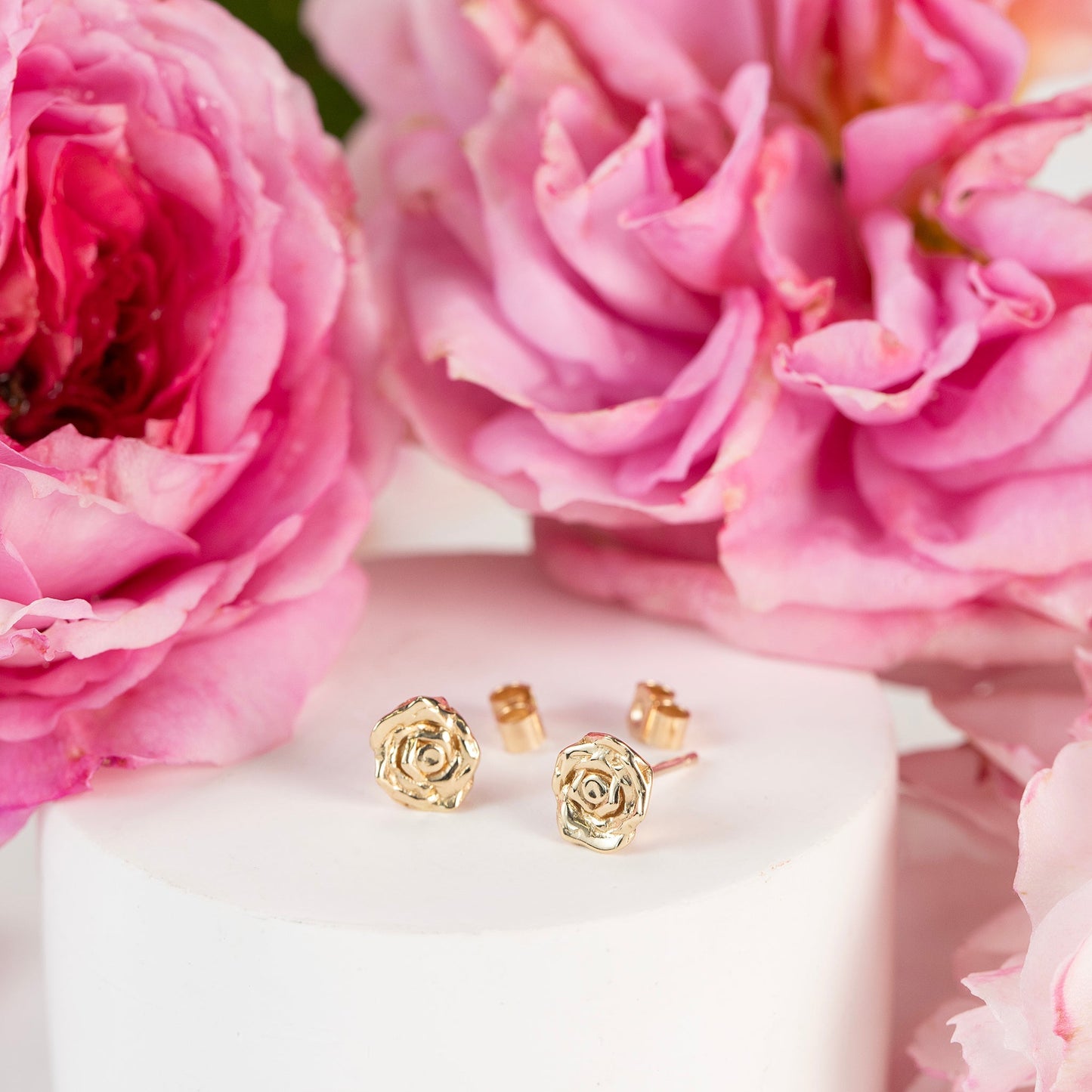 15th Anniversary Gift - Rose Flower Stud Earrings - 9kt Gold