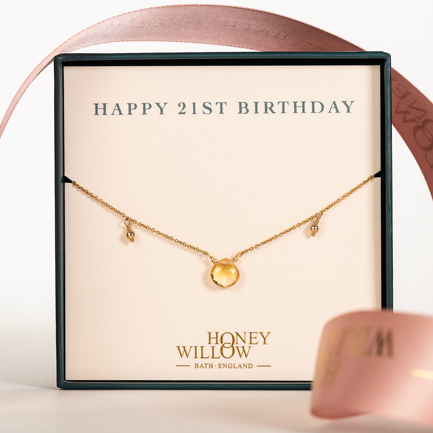 Celebrate your loved one's 21st birthday with a delicate necklace, handmade with her birthstone (see image 4 for examples) and tiny silver or gold-fill balls.