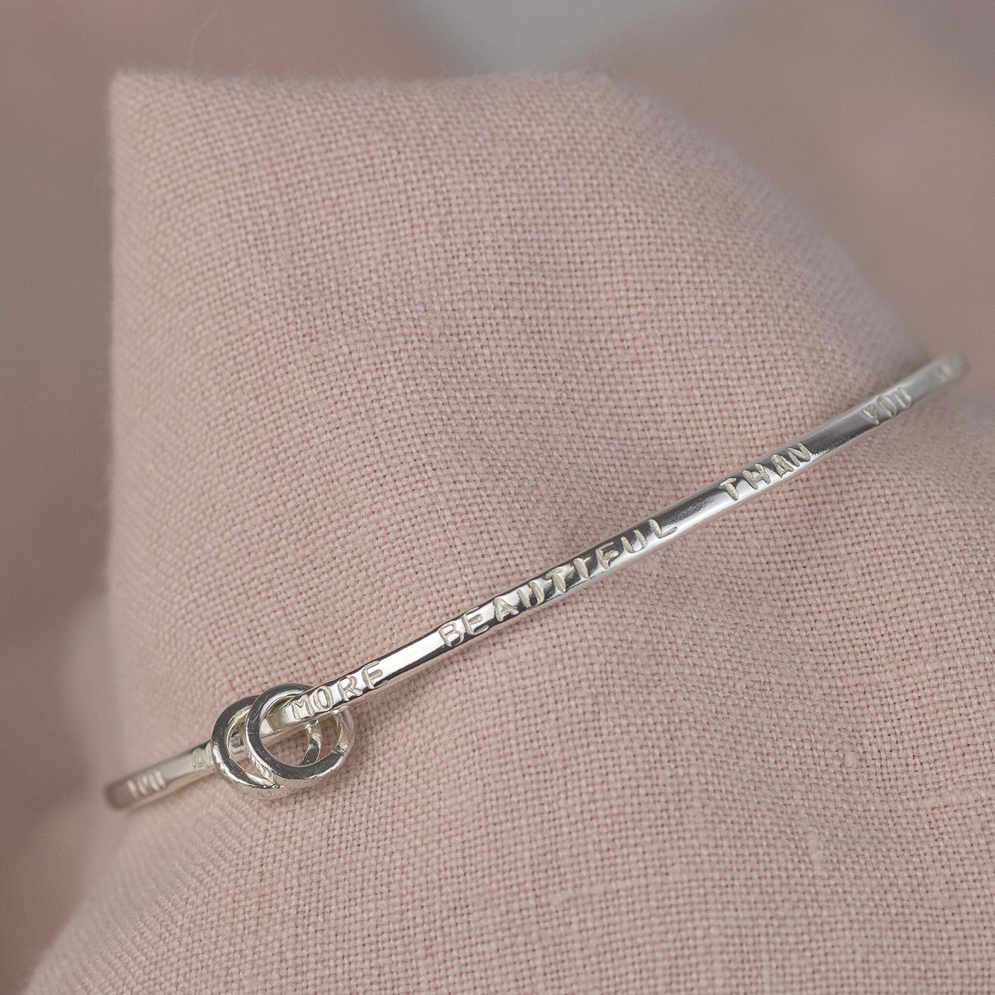 We can stamp up to 40 characters on the bangle. The inside diameter of the bangle is 6.5cm. Please contact us to discuss a different size. The bangle is 2mm wide.