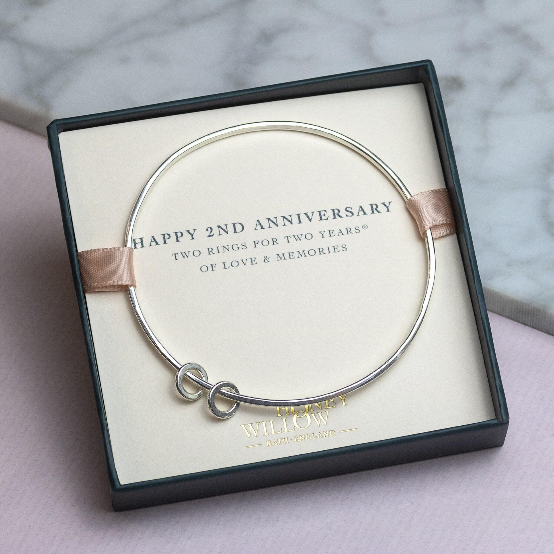 Two silver rings move around the bangle, representing two rings for two years® of love and memories.