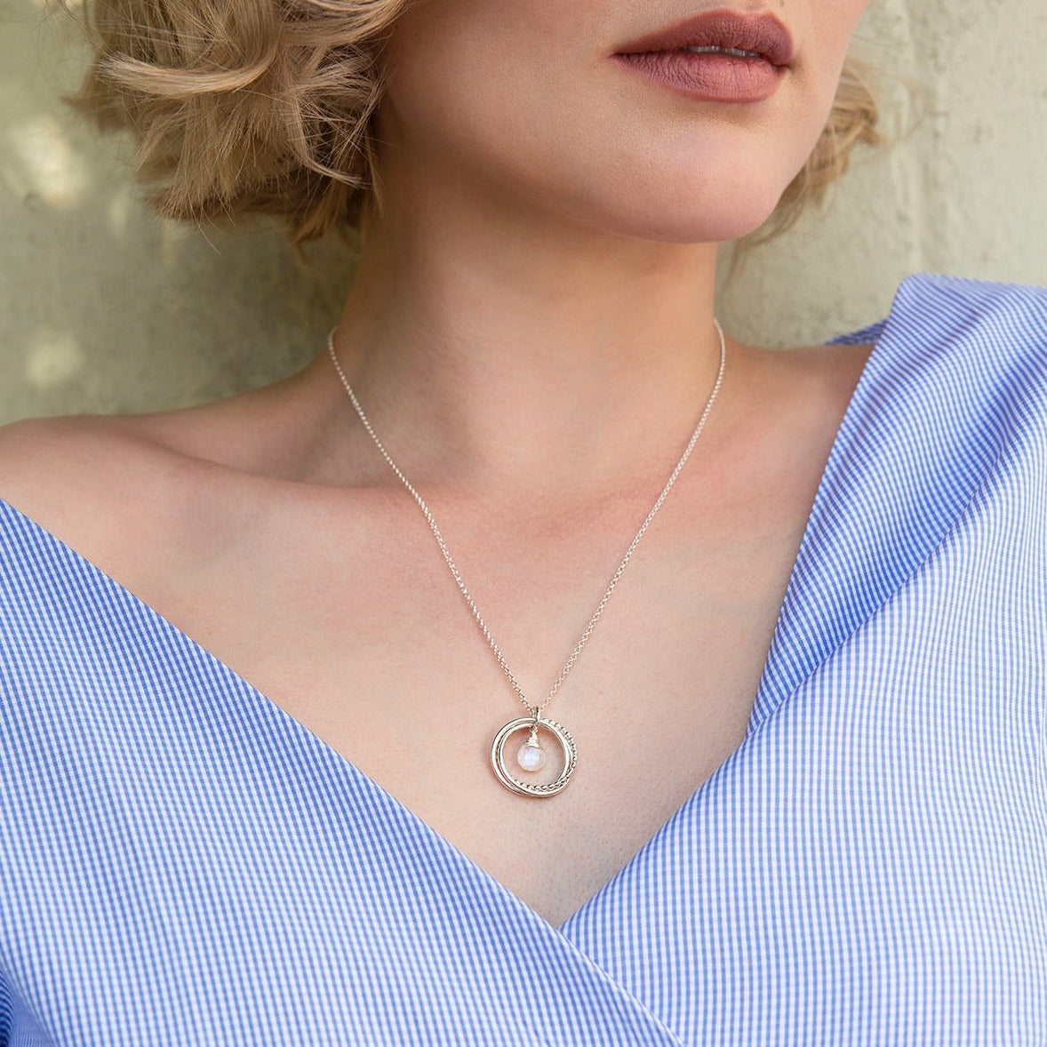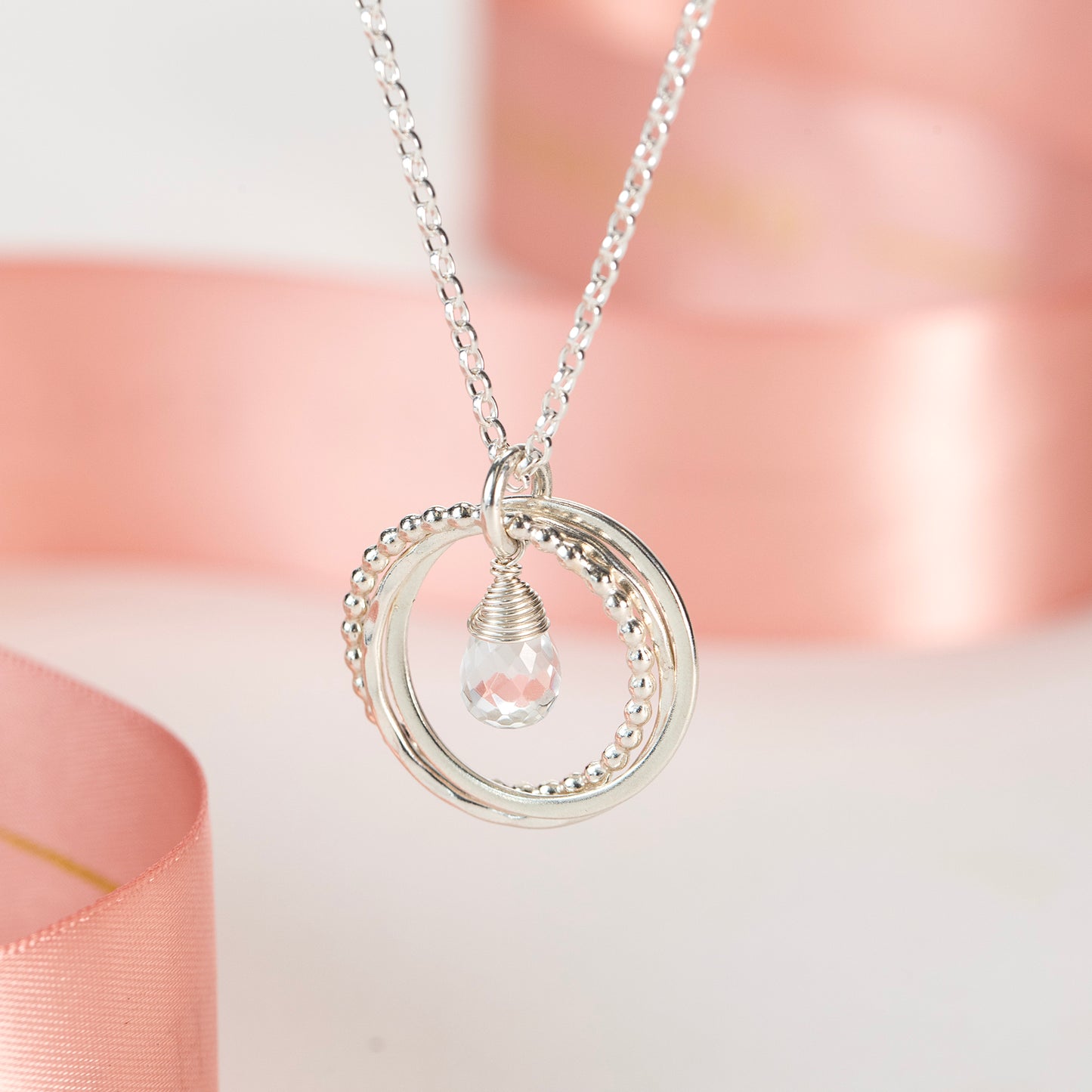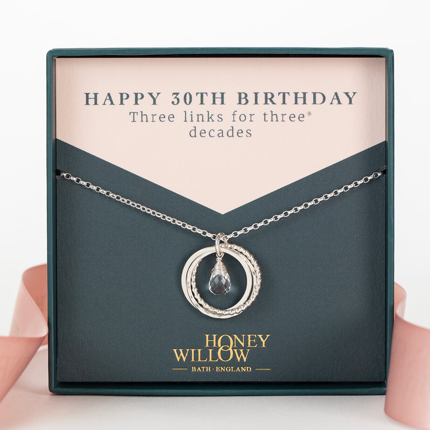 Circles symbolise infinite love, strength, protection and unity. Three linked circles symbolise her three decades. A birthstone sits in the centre, see image 4 for examples.