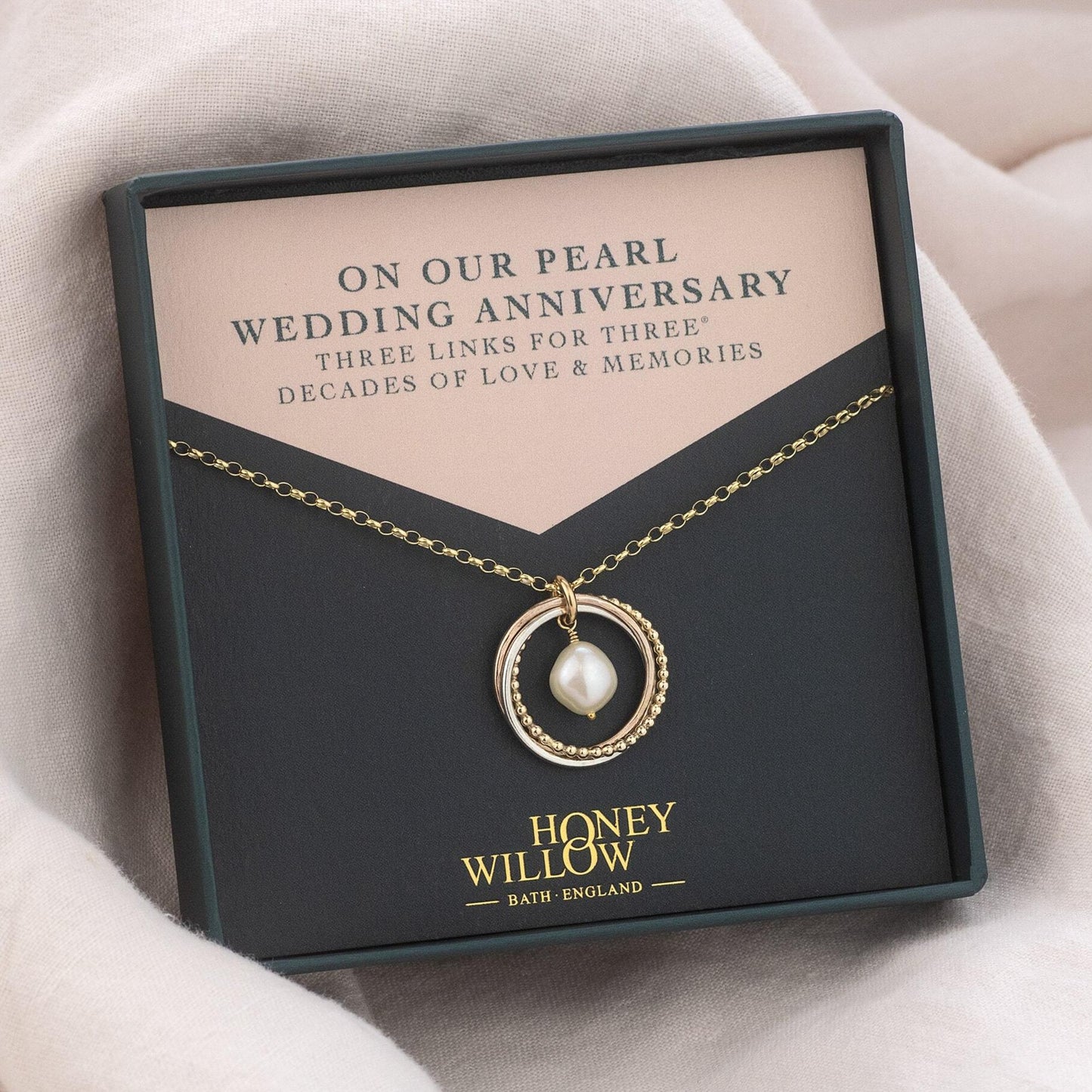 Celebrate your 30th wedding anniversary with a 9kt gold three links for three® decades necklace.  A keishi pearl sits in the middle of the pendant, to symbolise the pearl wedding anniversary.