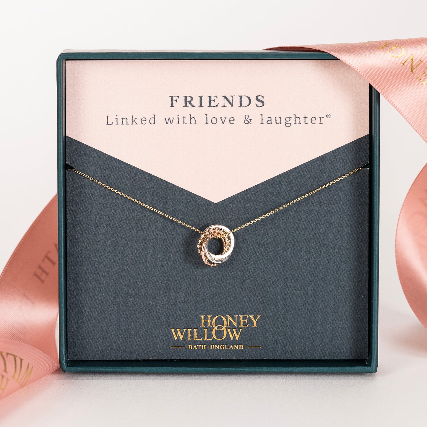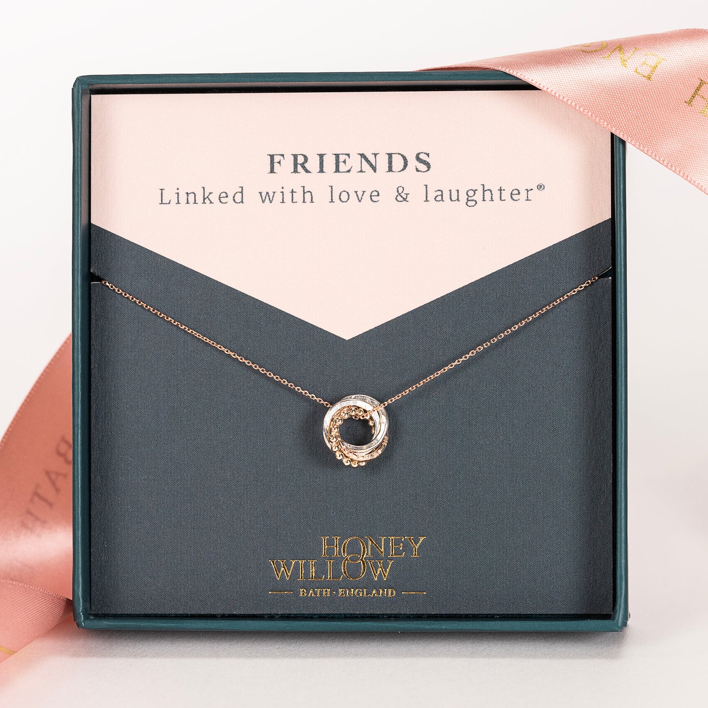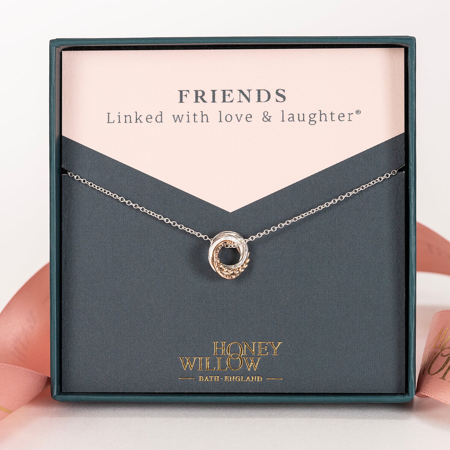 Give your loved one the original linked with love and laughter love knot necklace, designed and handmade in Bath, England.