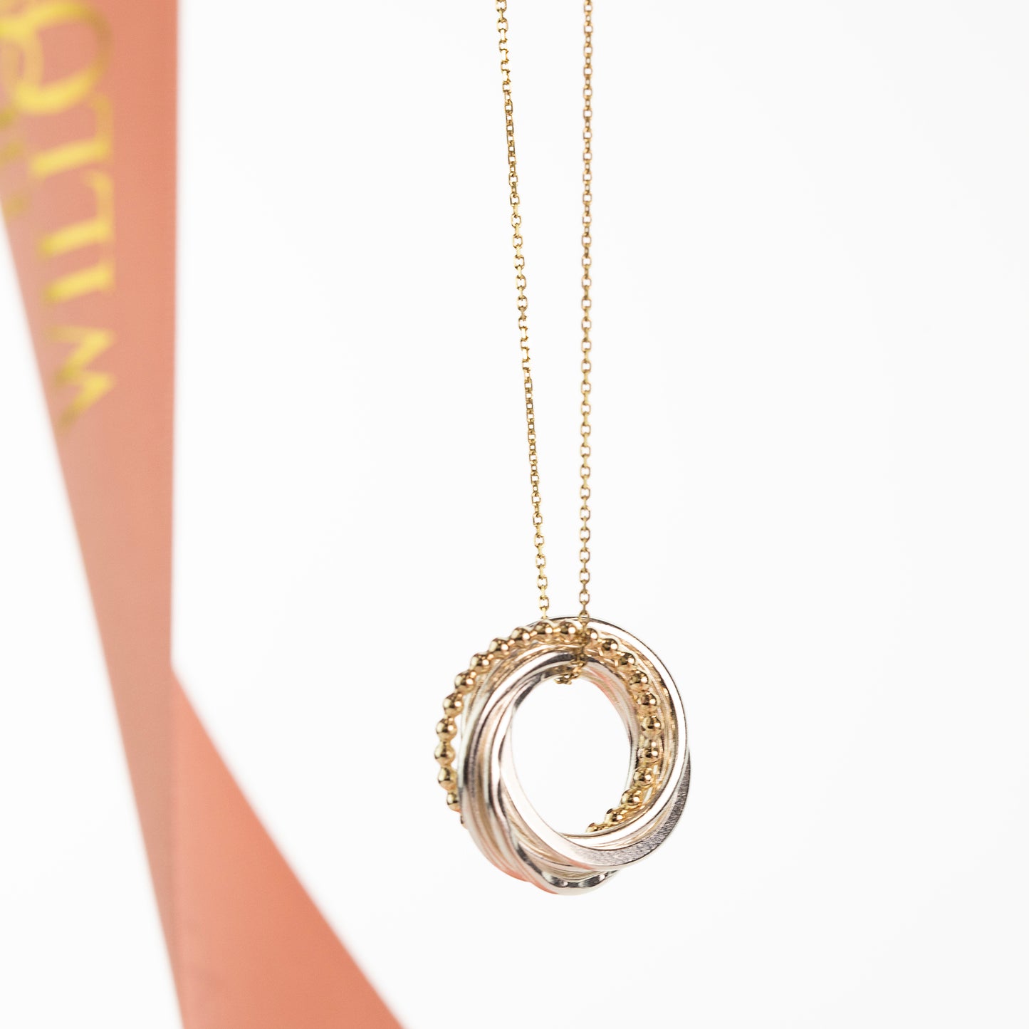 Circles symbolise infinite love, strength, protection and unity. Six circles are linked, five handmade with silver and the sixth with 9kt gold, to symbolise her sixth decade.