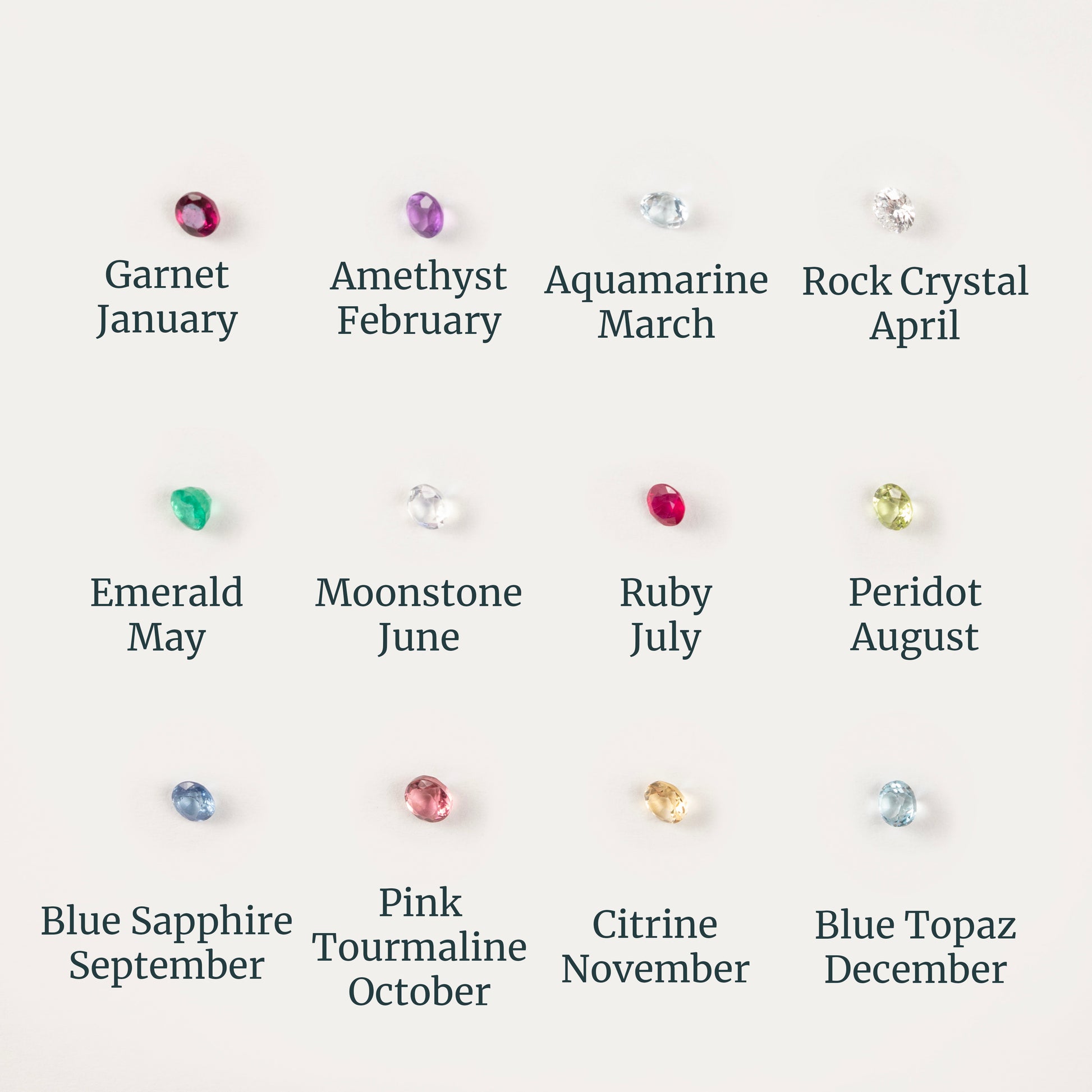 Image 2 shows the birthstones we use. Please note that the diamonds are lab-grown. A lab-grown diamond is made from the same material as a mined diamond, without the ethical and environmental problems.