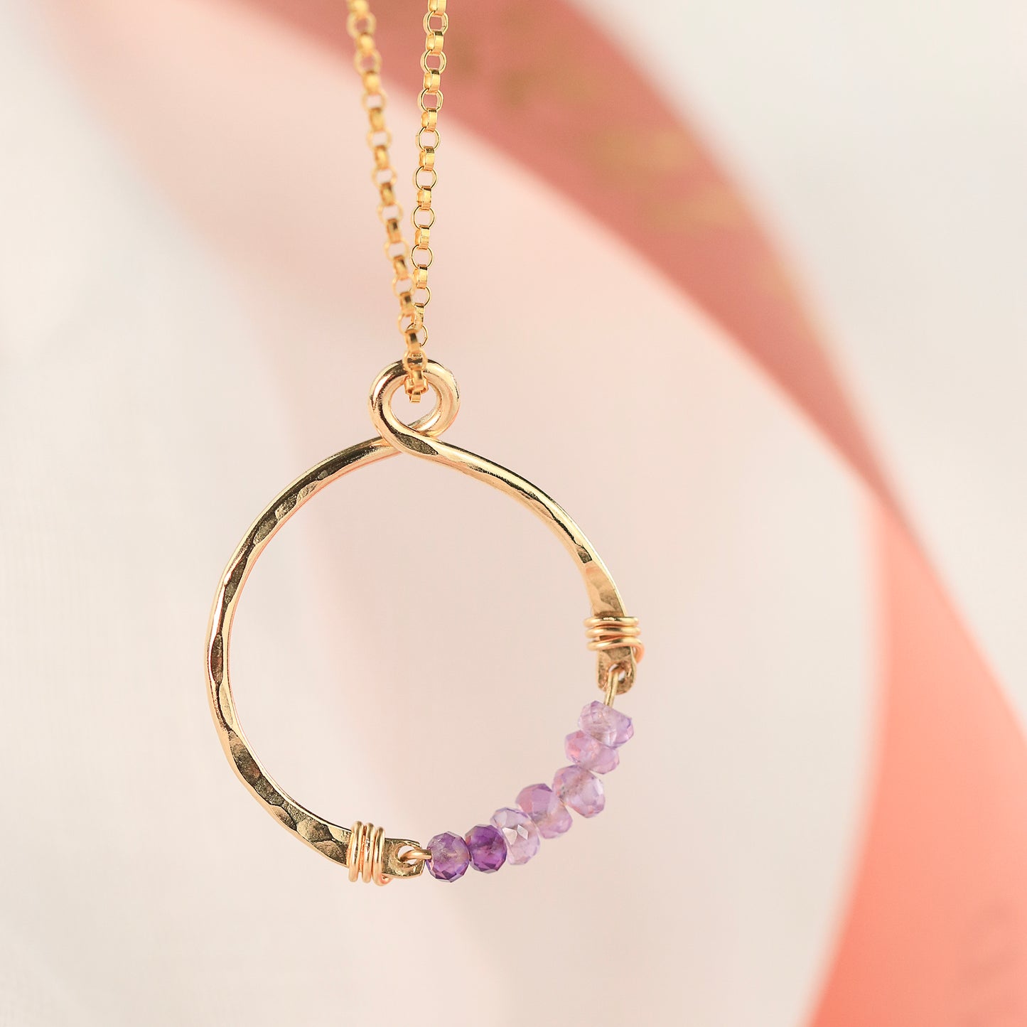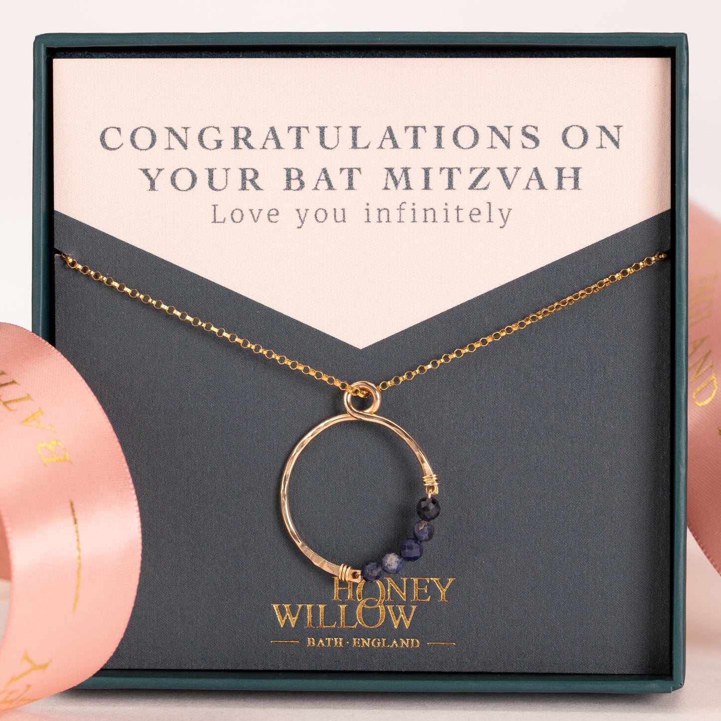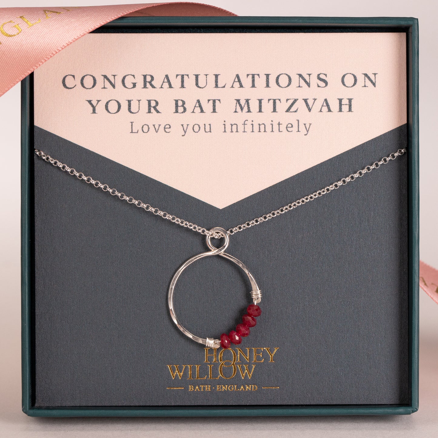 Celebrate your loved one's bat mitzvah with an infinity pendant, handmade for her with her birthstone.