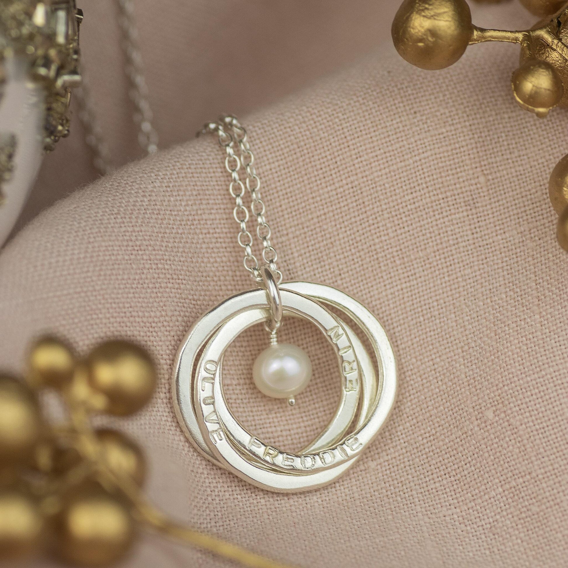 Celebrate her family with a sterling silver three linked circle necklace, handmade just for her.  Each link is hand-stamped with the name, date or word that is meaningful to her.  At the heart of the necklace sits the birthstone of your choice.