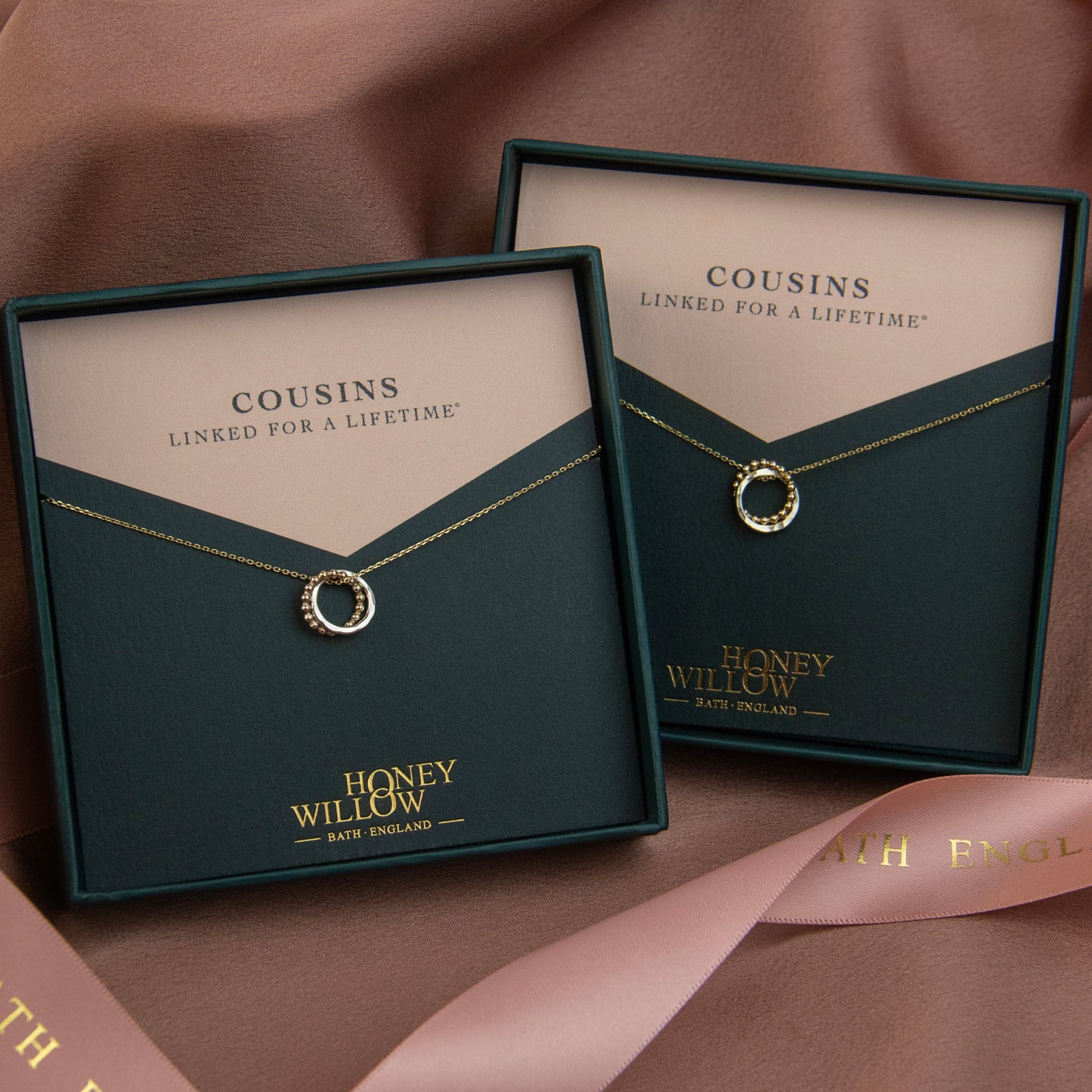 Celebrate the bond between cousins with a matching set of 9kt gold and silver love knot necklaces.