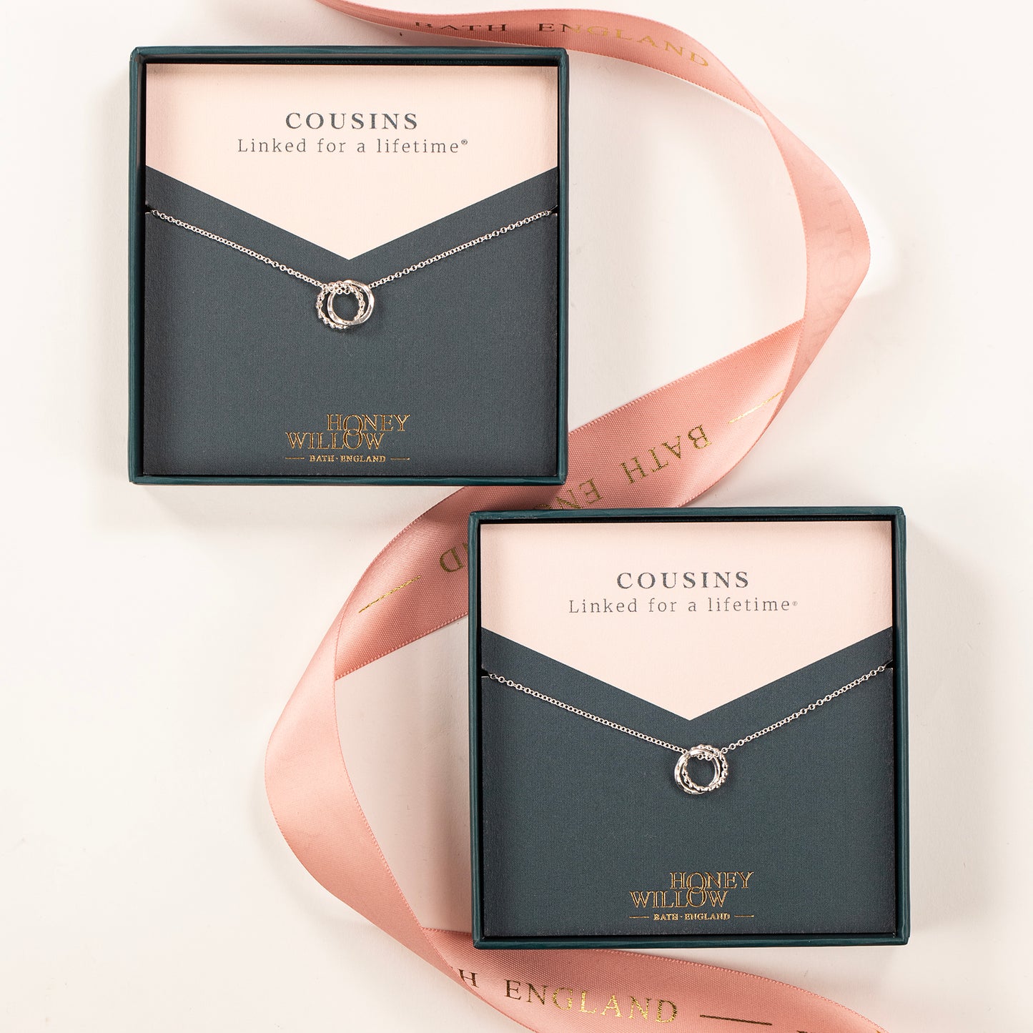 Circles symbolise infinite love, strength, protection and unity. These necklaces are handmade with two circles linked for a lifetime®.