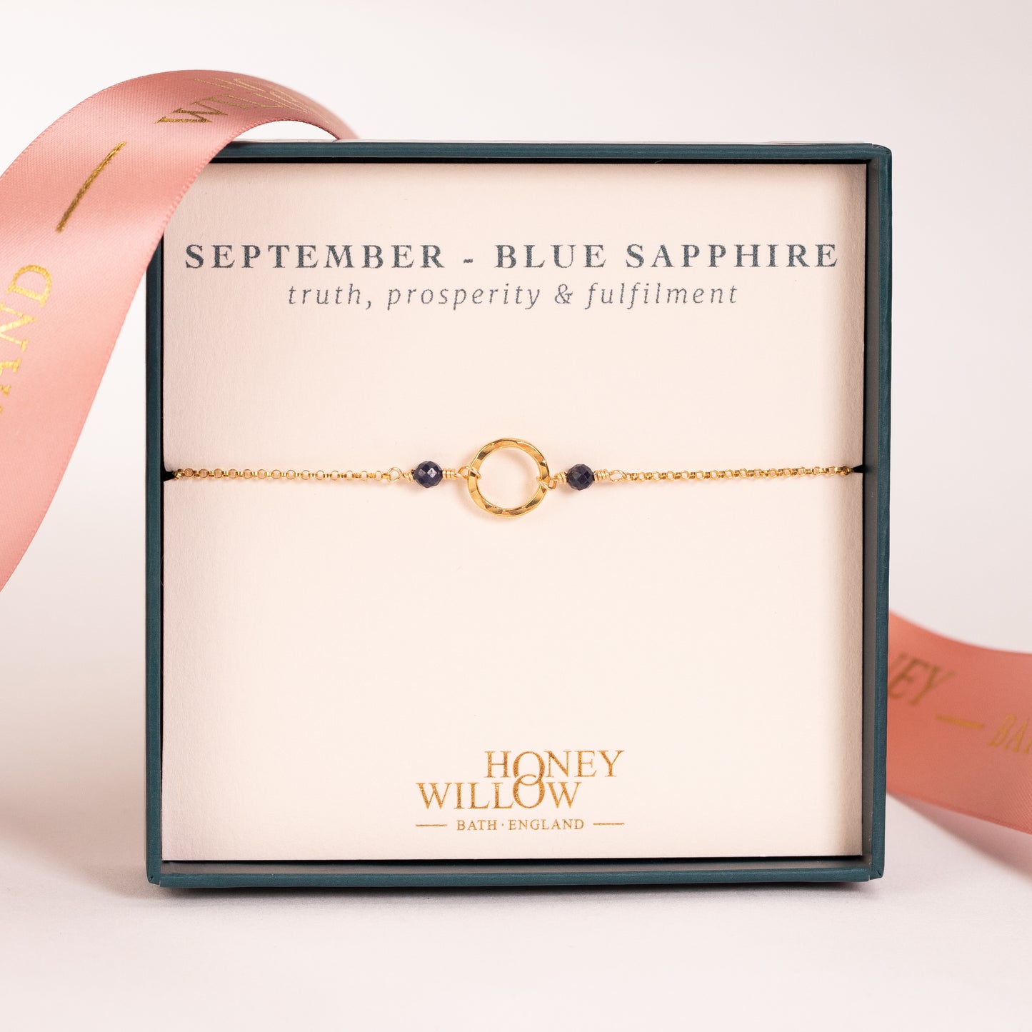 This delicate birthstone bracelet makes a pretty gift for a loved one. We can make this bracelet in either sterling silver or 14k gold-fill, with their birthstones on either side of the circle.
