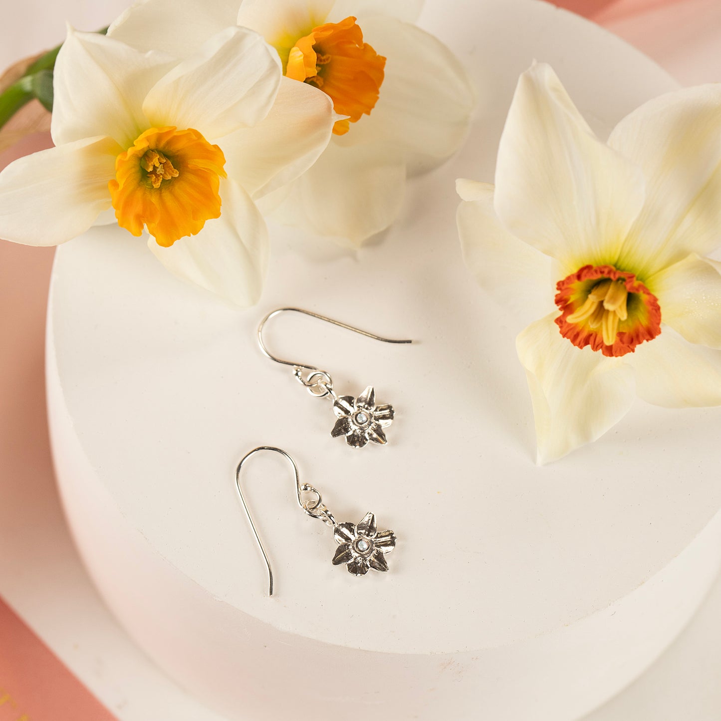 Celebrate her birth month with dainty daffodil flower earrings, made with recycled sterling silver.