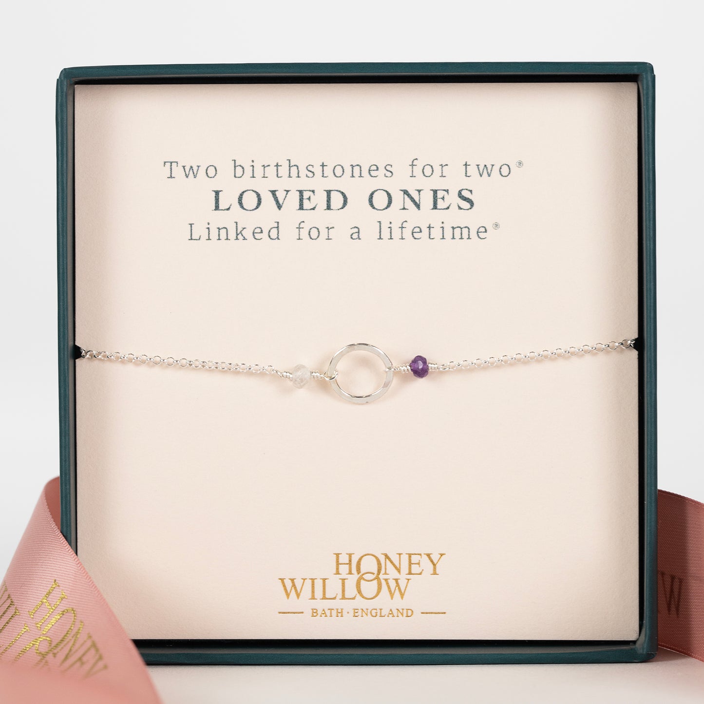 Gift her a halo bracelet handmade with two birthstones for two® loved ones.