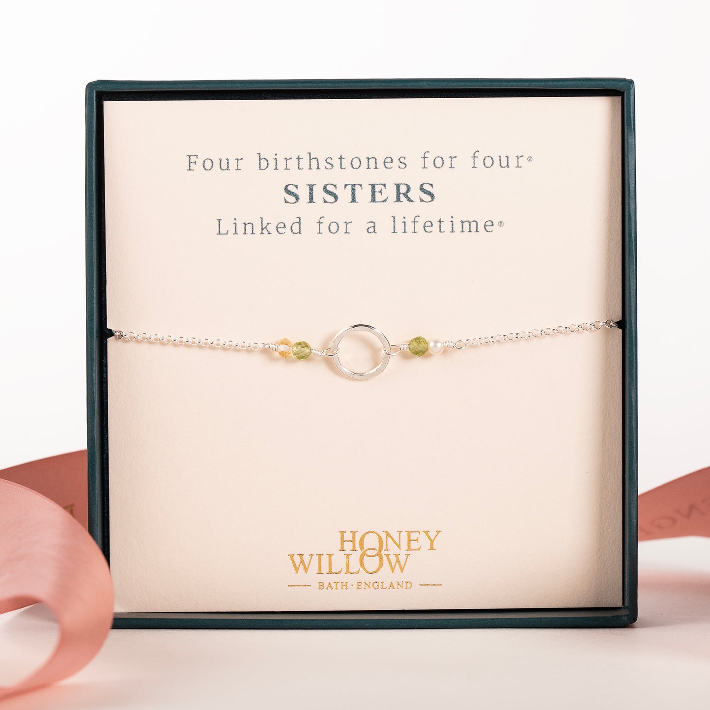 Celebrate her sisters with a halo bracelet handmade with four birthstones for four® sisters.