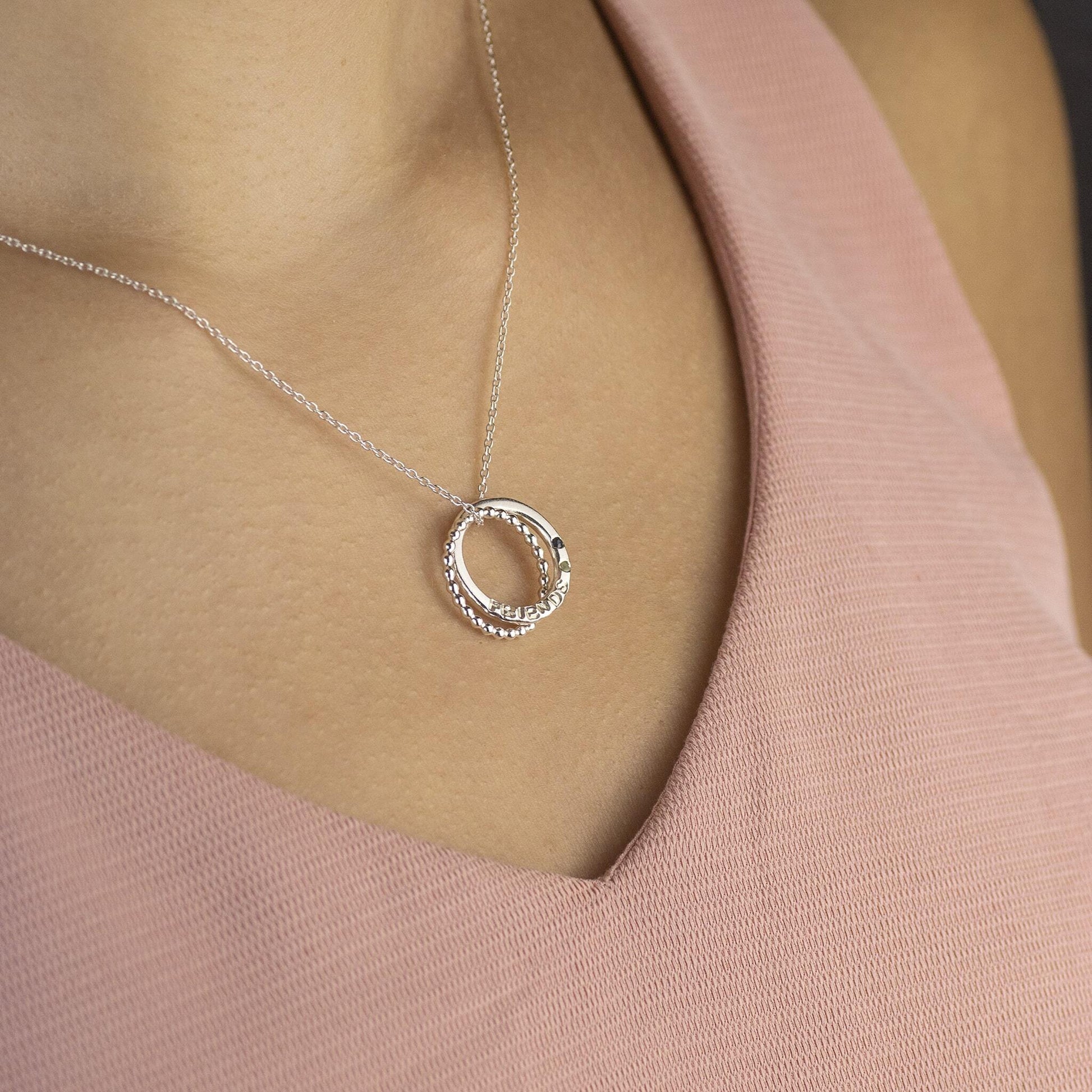 Circles symbolise infinite love, strength, protection and unity. Three circles are linked for a lifetime®. One link is hand-stamped and set with three birthstones for three® friends.
