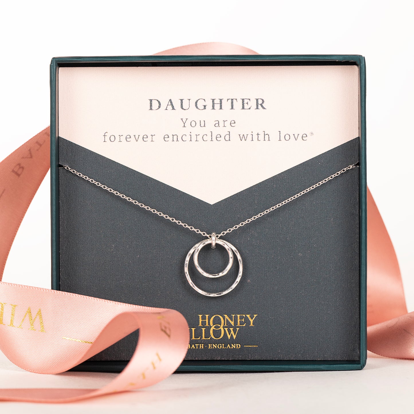 Celebrate your bond with petite double halo necklace, handmade with either hammered silver, beaded silver or 18k gold plating over silver.