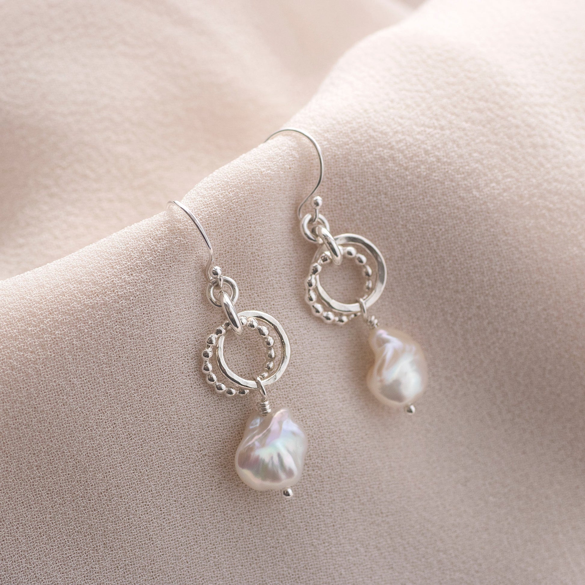 Handmade to order with sterling silver and 9kt yellow gold. A freshwater keishi pearl hangs from the double links.
