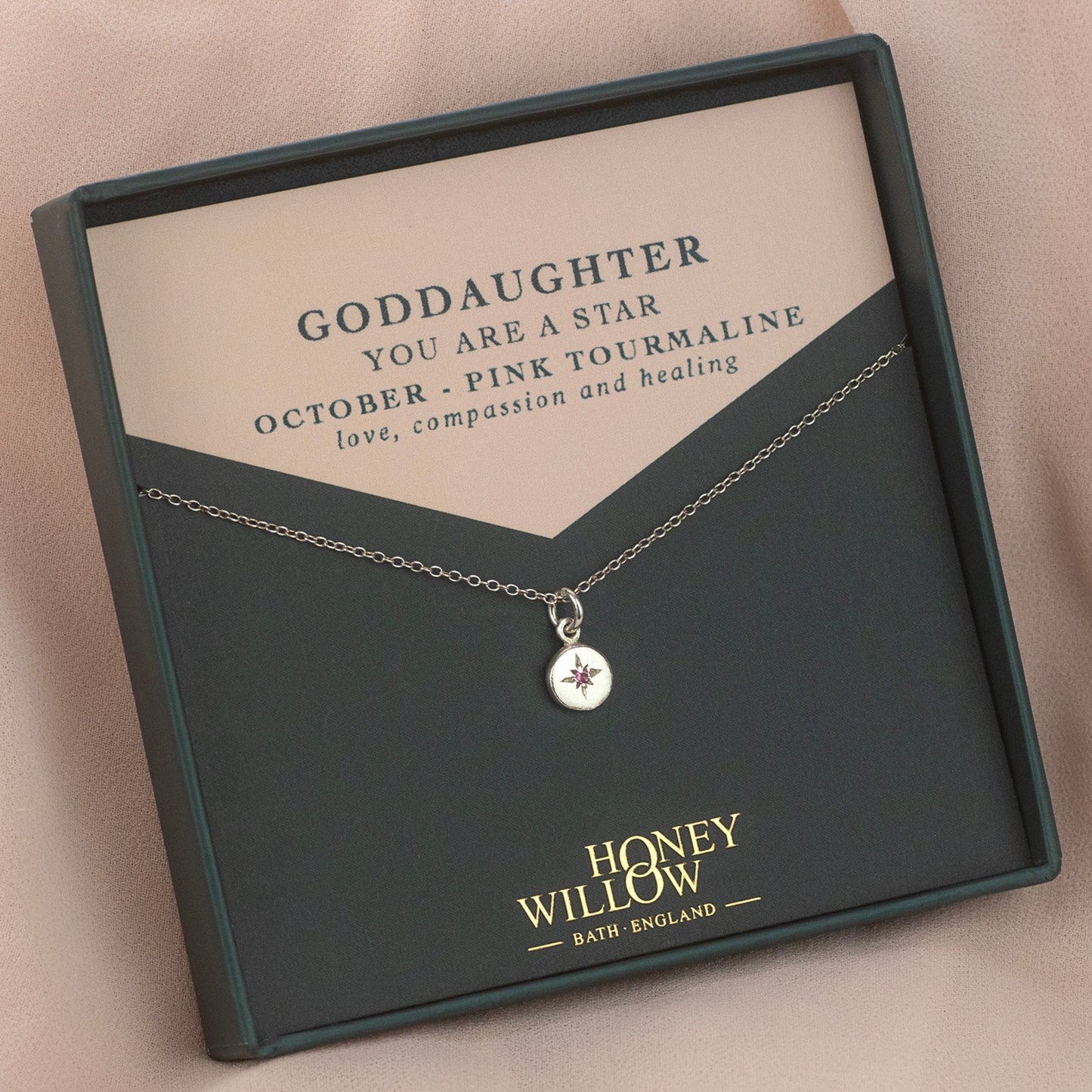 Let your goddaughter know she is a star, with a dainty silver pendant which is star-set with her birthstone.