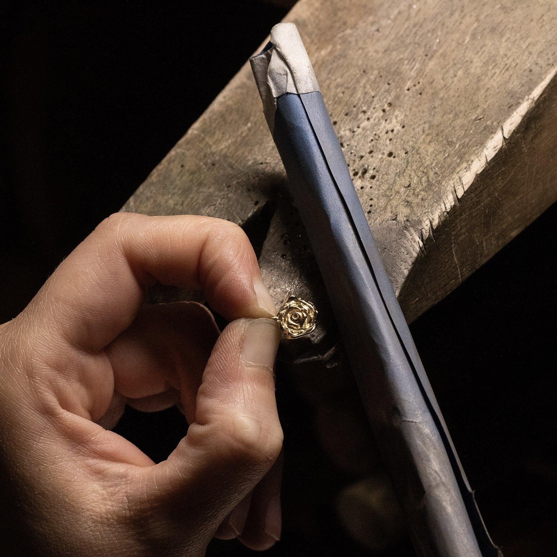 Made with recycled 9kt gold, the rose pendant is 1cm in diameter and is hallmarked by the London Assay Office.