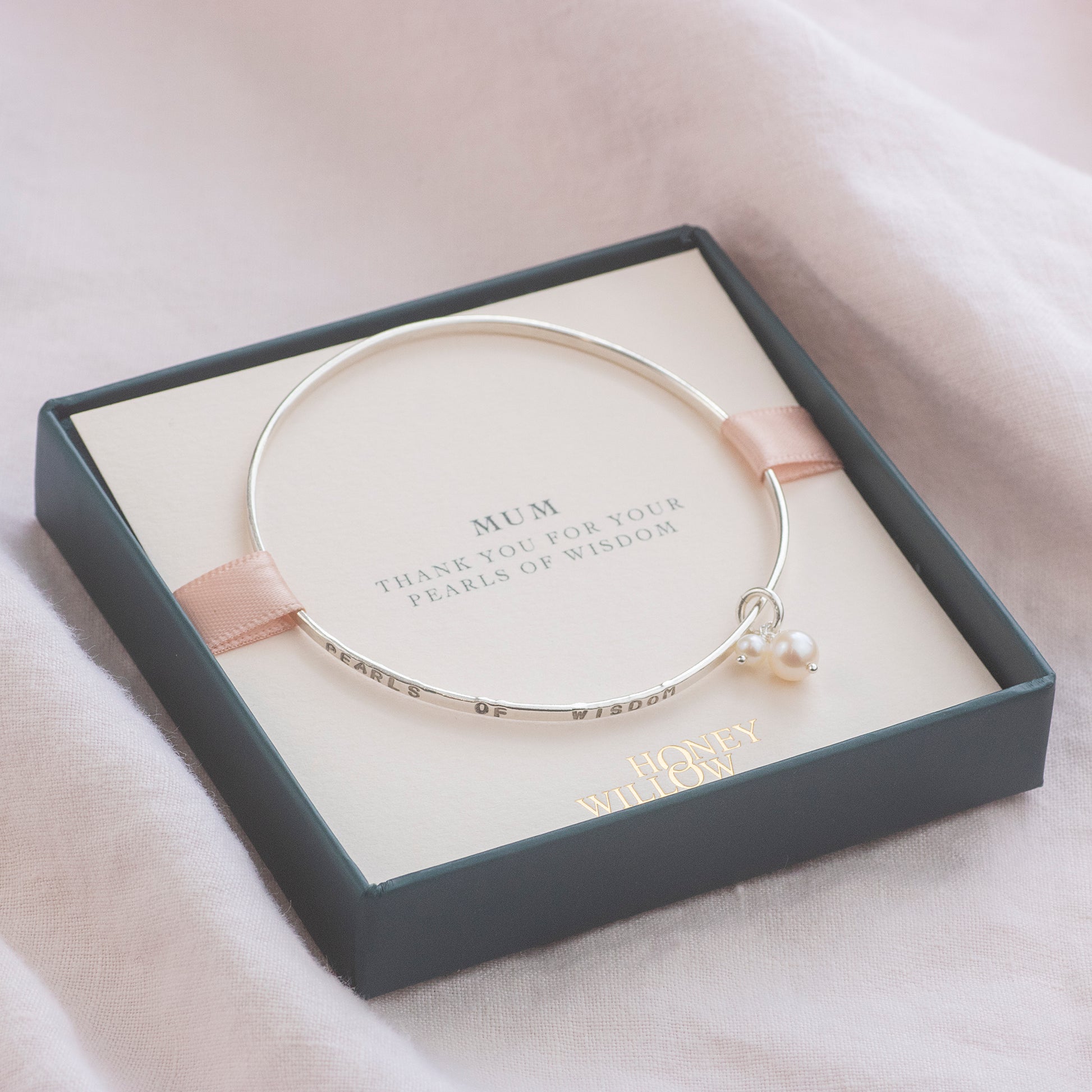 Celebrate your mum's wisdom with a personalised bangle, with pearls symbolising wisdom.