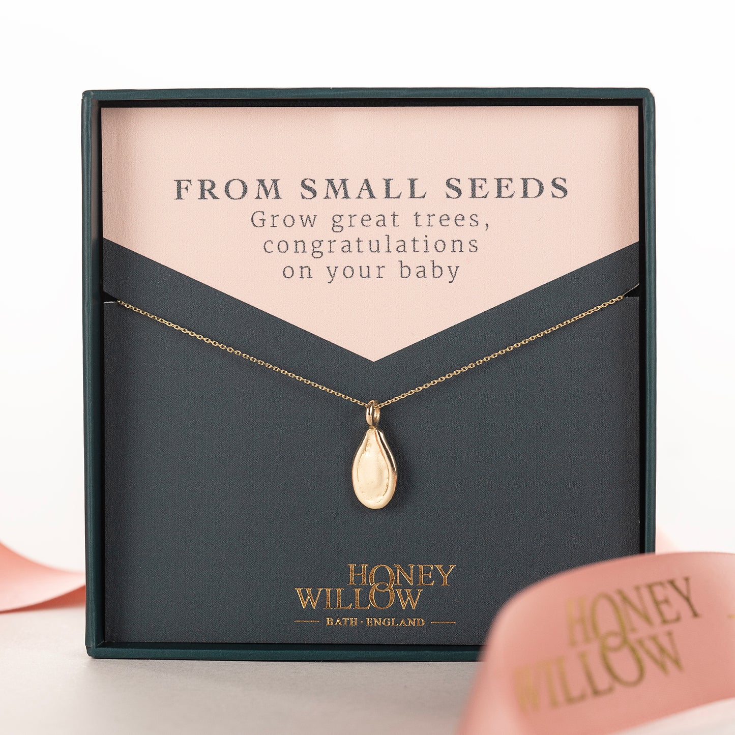 Give congratulations on her new baby, with a solid 9kt gold seed necklace, handmade in Bath, England.