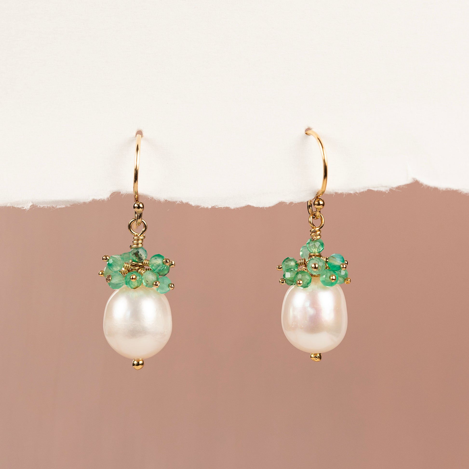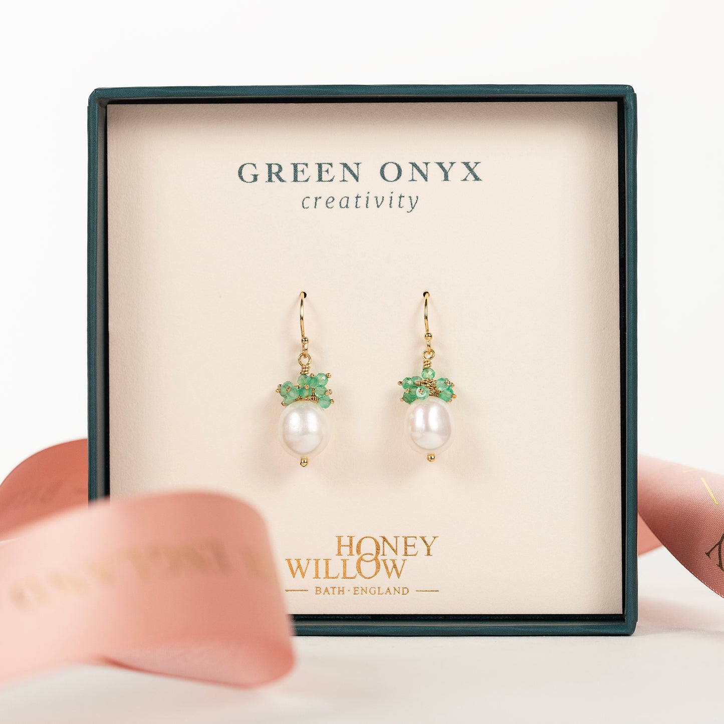 Green Onyx & Pearl Cluster Earrings - Creativity - Silver & Gold