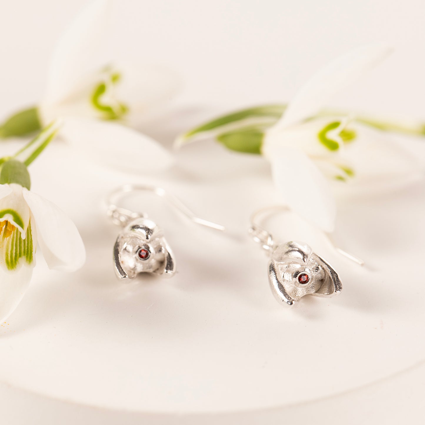 Snowdrop is the birth flower for January. These earrings are set with garnet, which is the birthstone for January. The birthstone is visible when the earrings are lifted.