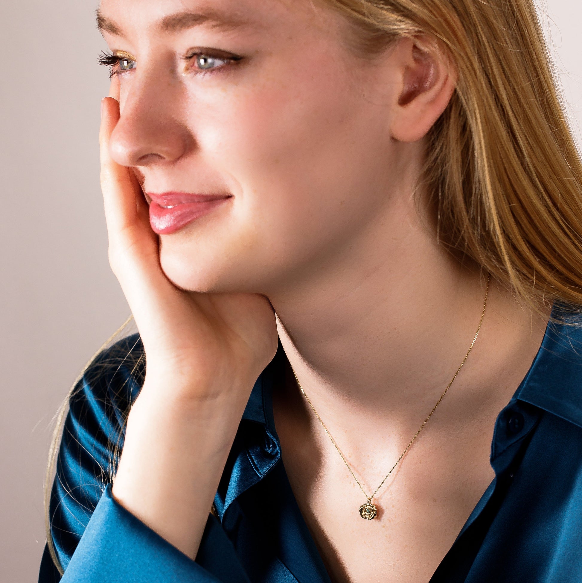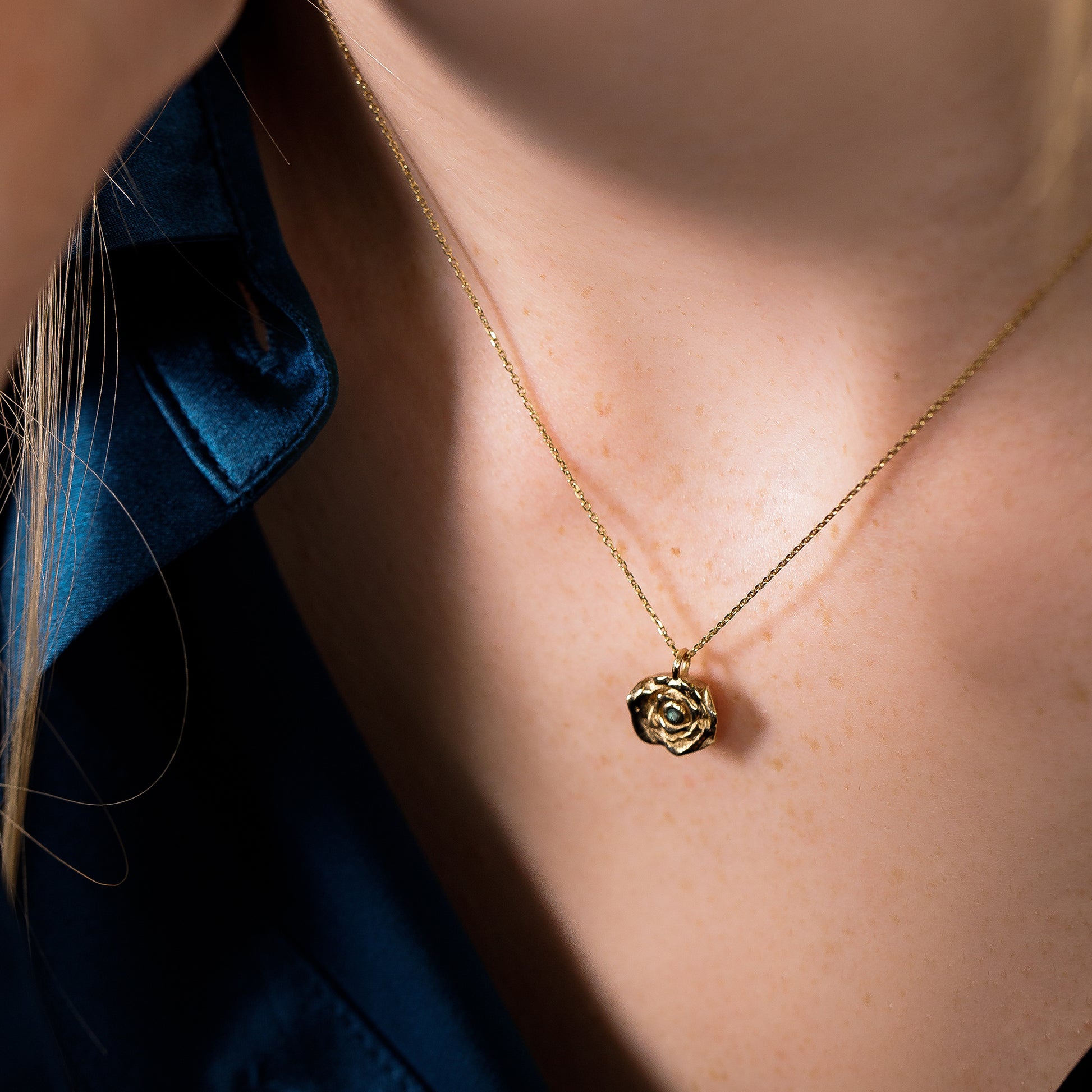 The rose pendant is 1cm in diameter and set with a 1.5mm birthstone. The model is wearing a necklace without the birthstone.