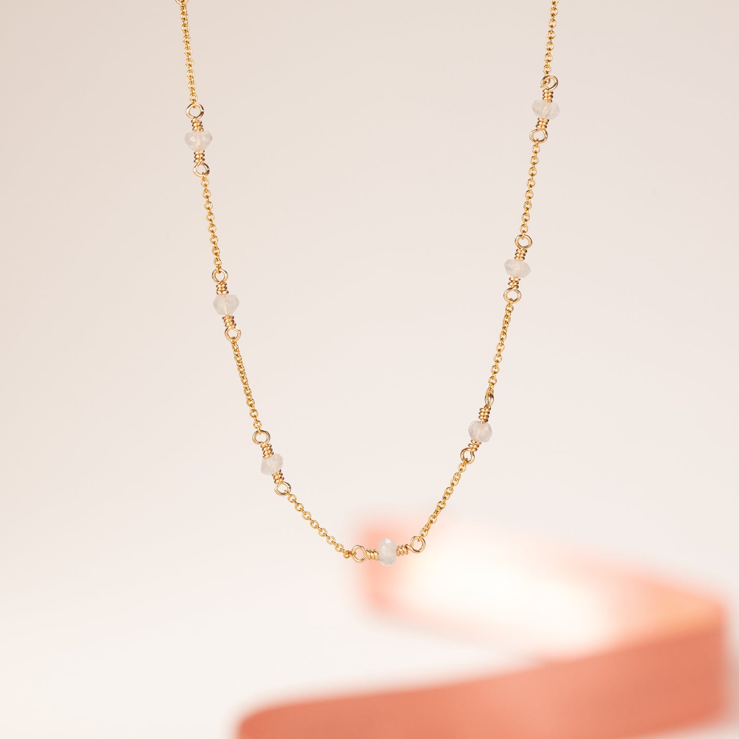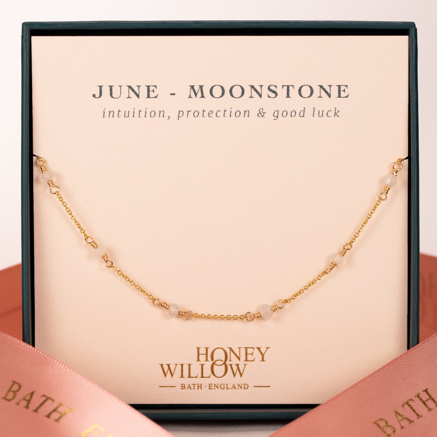 Celebrate her June birthday with a delicate satellite necklace handmade with tiny birthstones hand-wired into the chain. The necklace is worn short, like a choker and is perfect for layering.