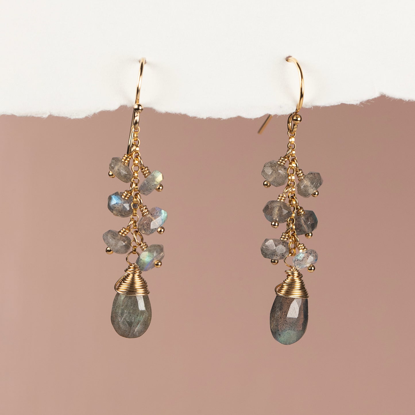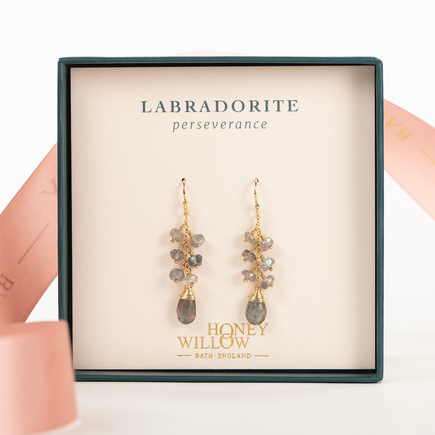 Give her a meaningful gift that celebrates and inspires her. These gemstone cluster earrings are handmade with labradorite stones, which symbolise perseverance.