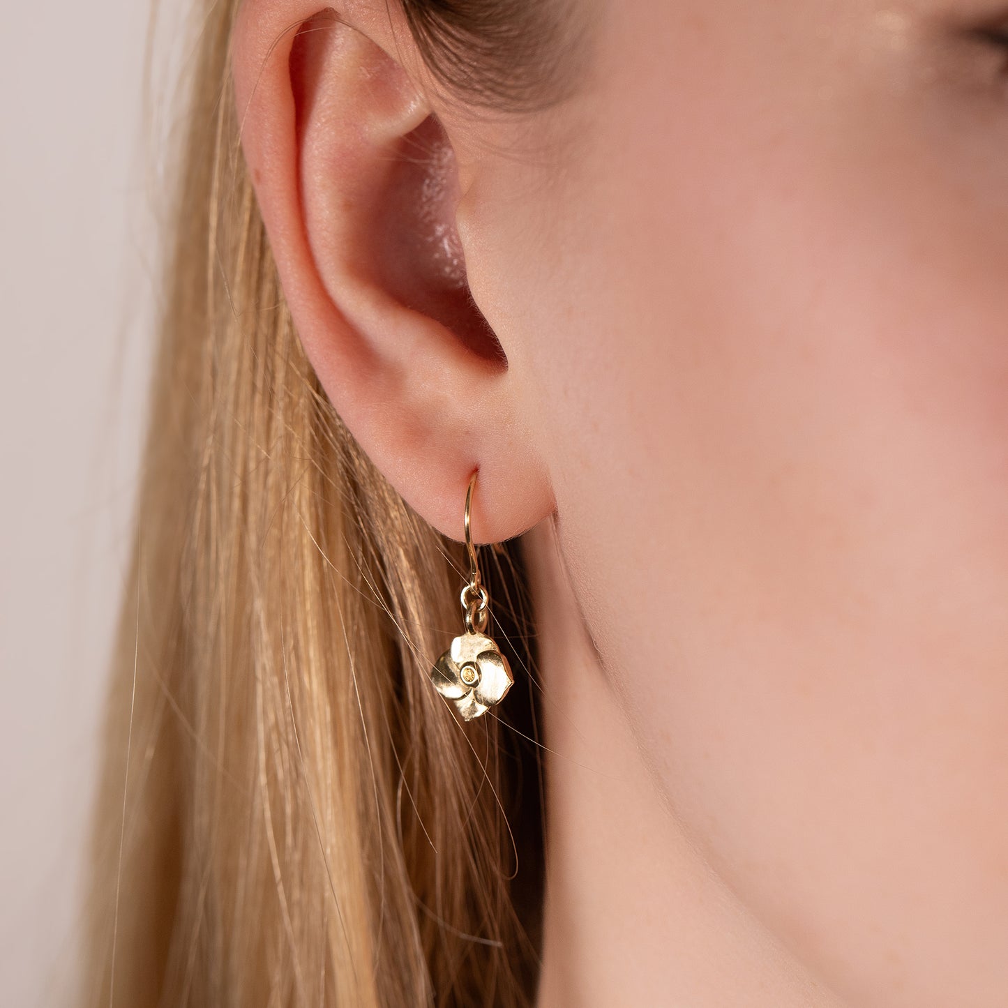 The hydrangea earrings are 1.5cm in drop, and set with a 1.5mm birthstone. They are hallmarked as 9kt gold.
