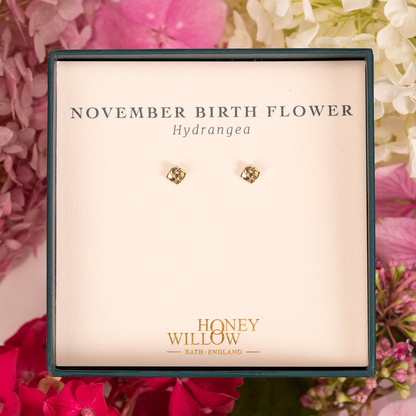 November Birth Flower Stud Earrings - Hydrangea - 9kt Gold