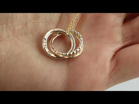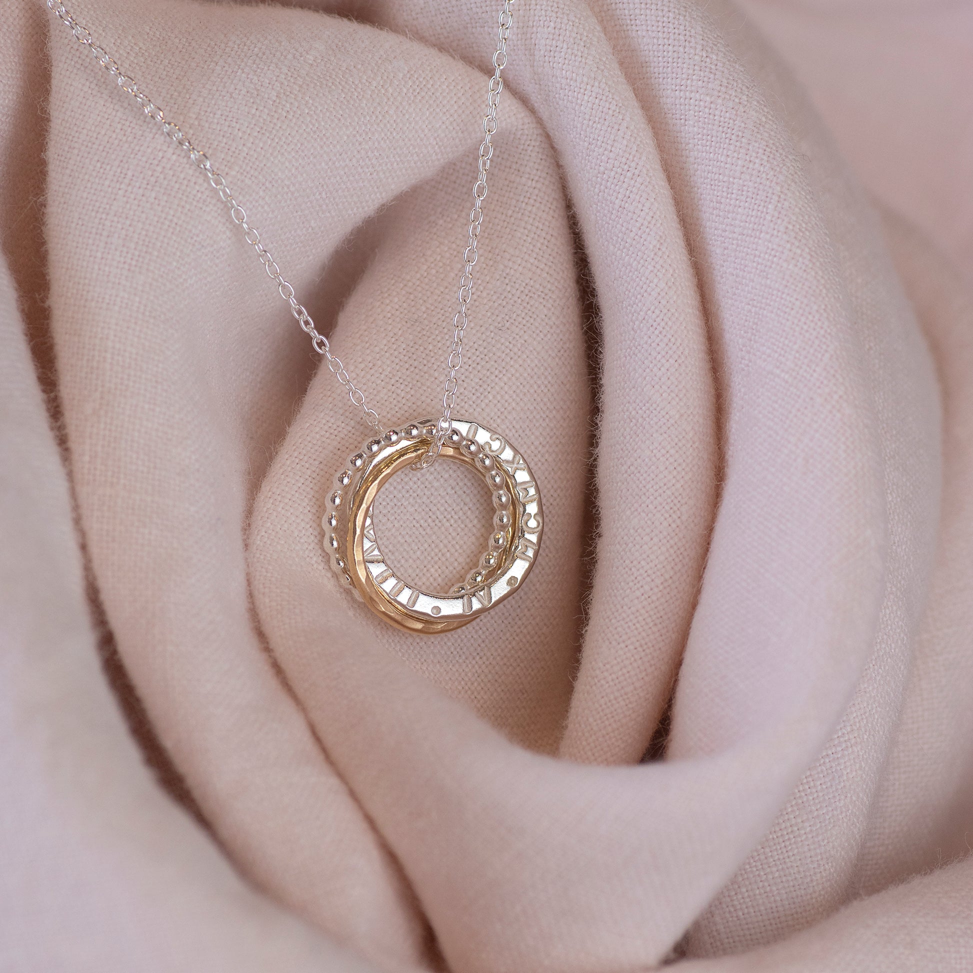 Circles symbolise infinite love, strength, protection and unity. Three circles are linked to represent her three decades. One link is hand-stamped with the name, or date or words which are meaningful to her - up to 15 characters.