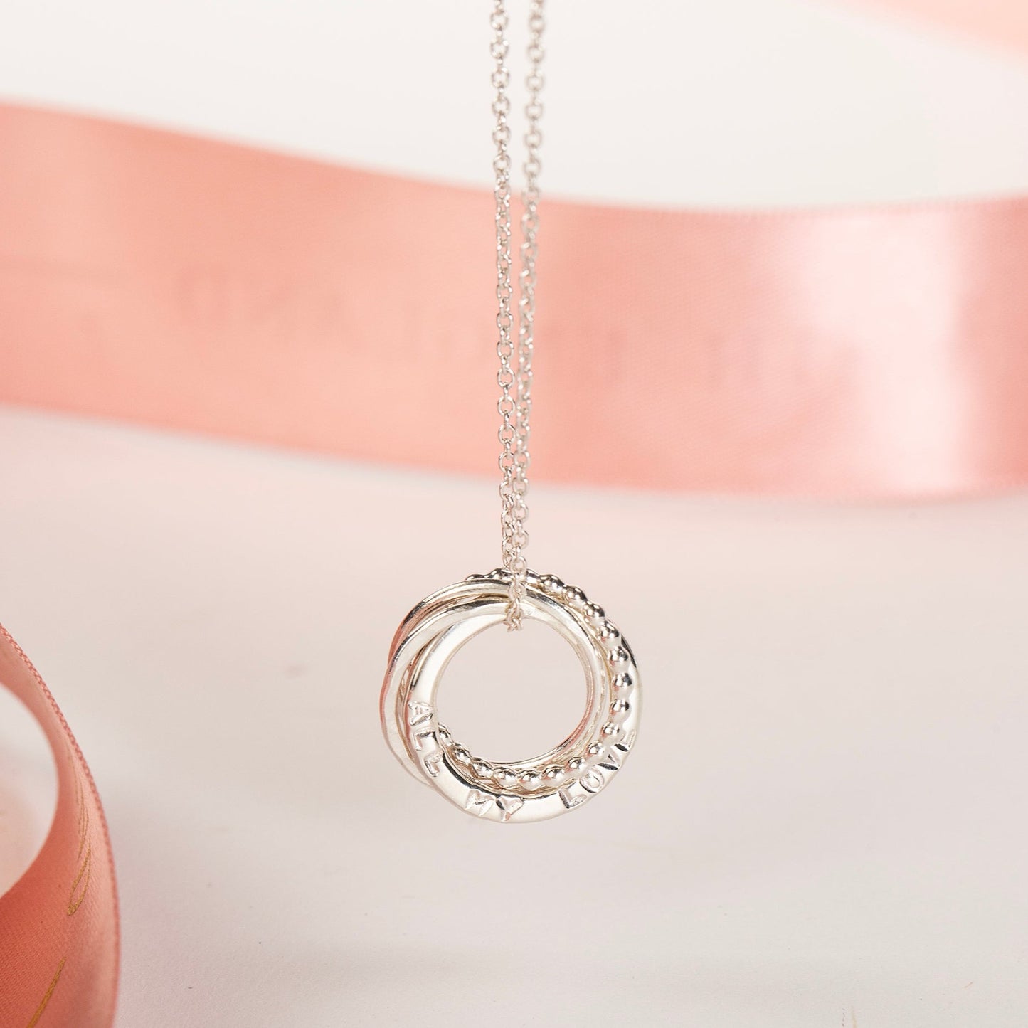 Circles symbolise infinite love, strength, protection and unity. Four circles are linked to symbolise her four decades. One link is hand-stamped with the name, word or date that is meaningful to her, up to 15 characters.