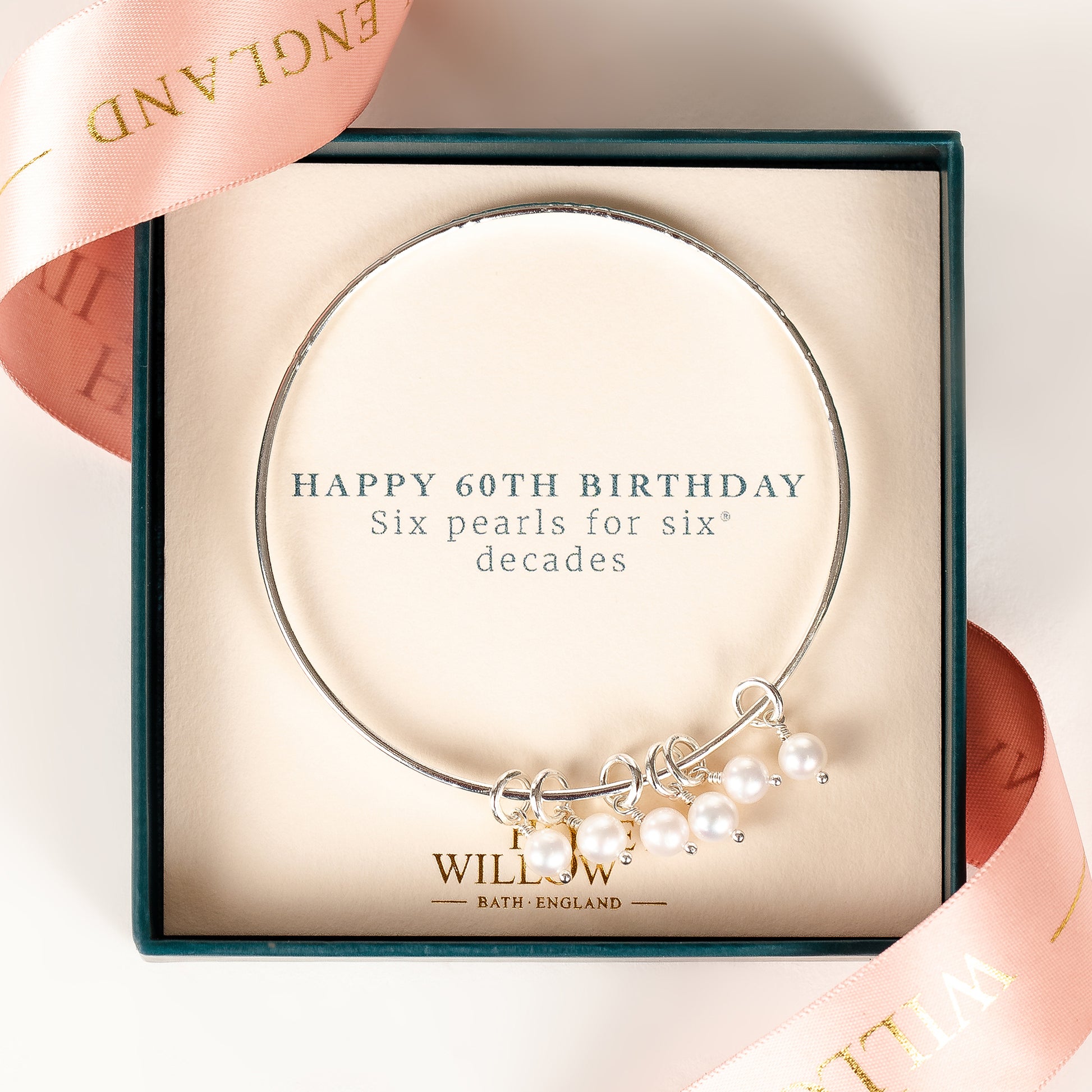 Celebrate her 60th birthday with a personalised silver bangle, hand-stamped with the names, or date or phrase that is meaningful to her. Moving around the bangle are six pearls for six® decades of life, love and laughter.
