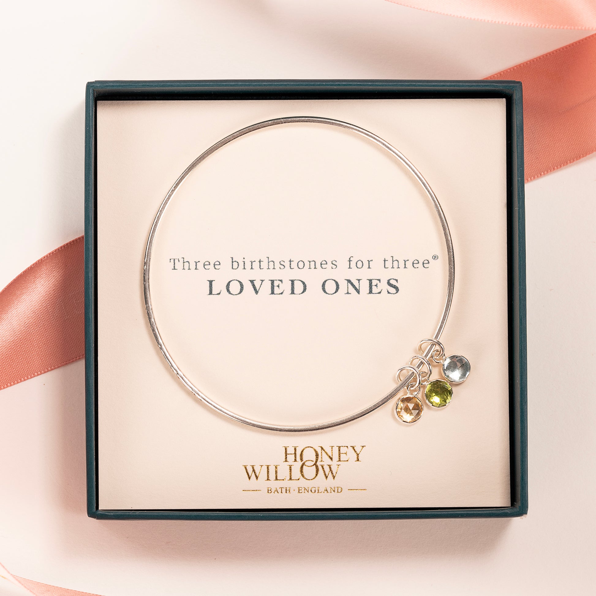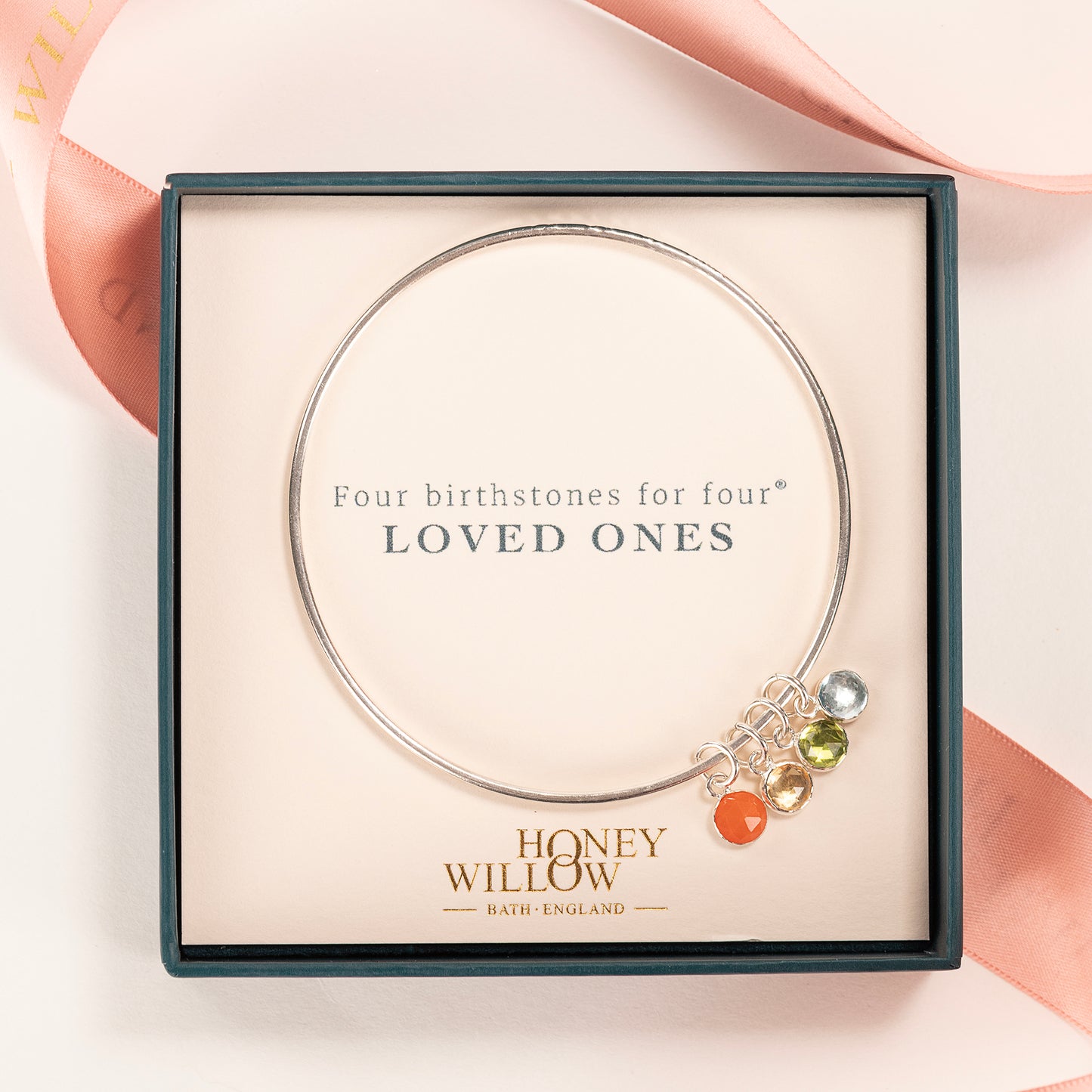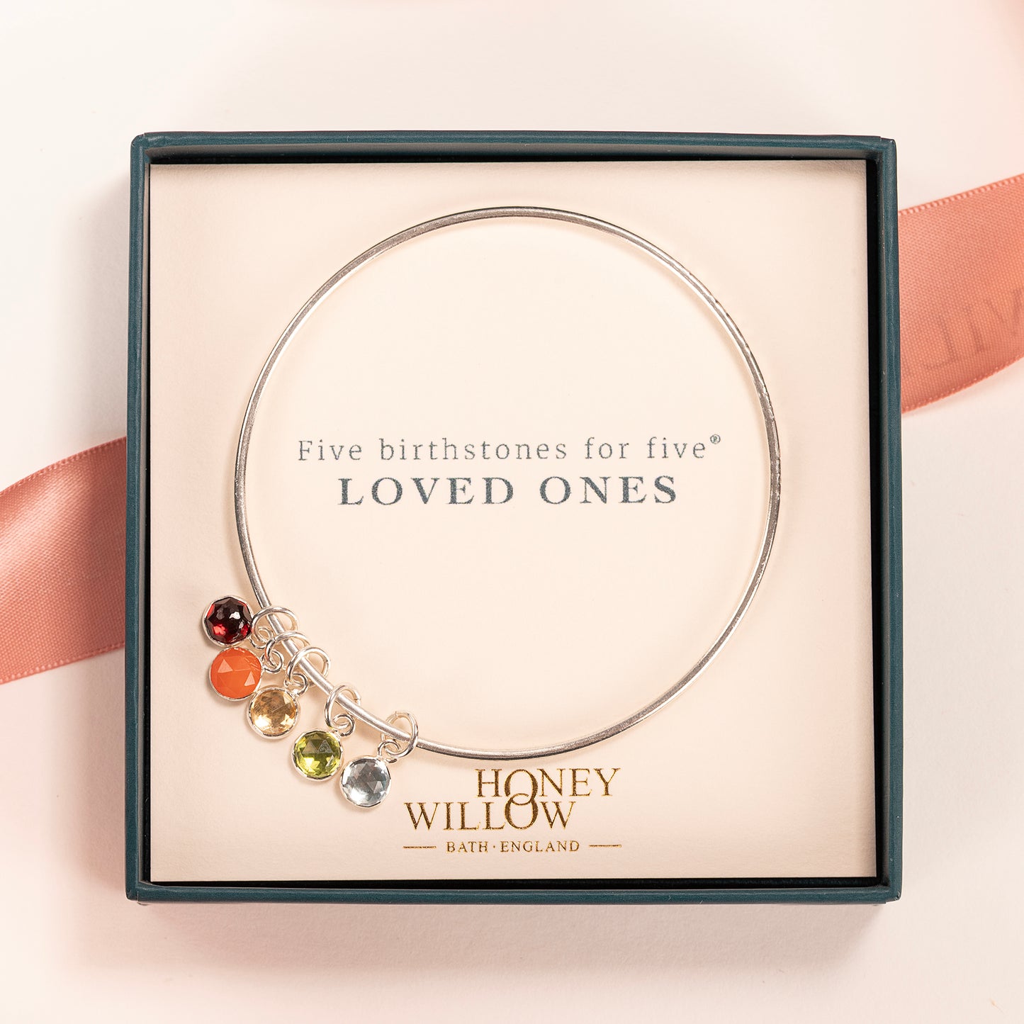 Celebrate her loved ones with a personalised silver bangle, hand-stamped with names, dates or a phrase with meaning for her. We set the birthstones of her loved ones and hang them from the bangle.