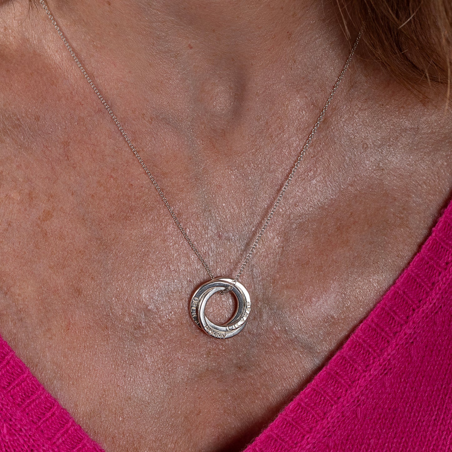 Circles symbolise infinite love, protection and unity. Three circles are linked for a lifetime®. Each link is hand-stamped with the name, date or word that is meaningful to her.