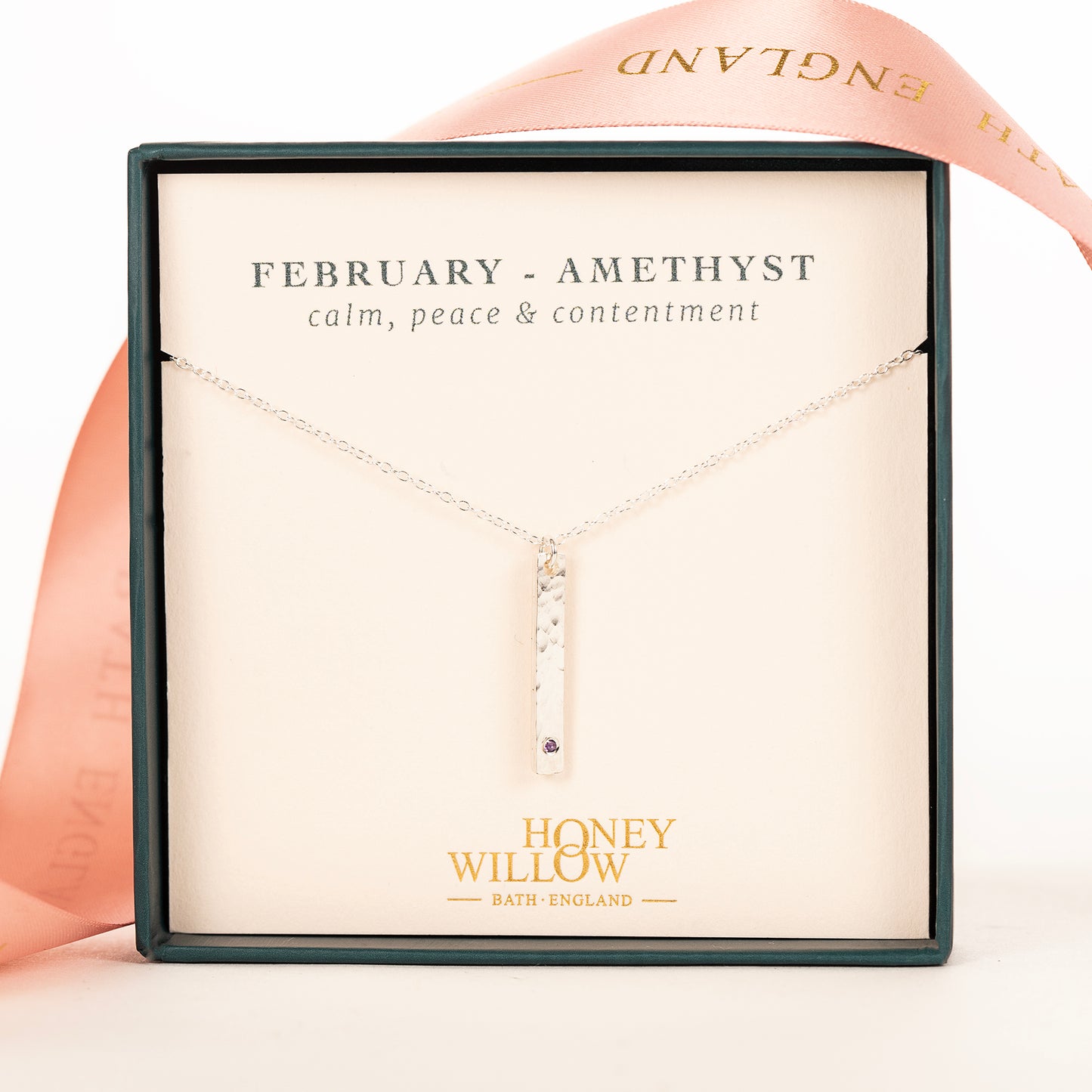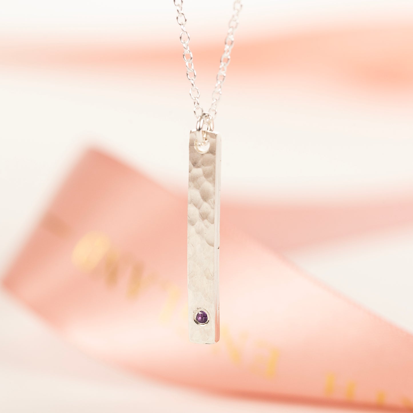This silver column necklace is handmade with her birthstone, see image 4 for examples.
