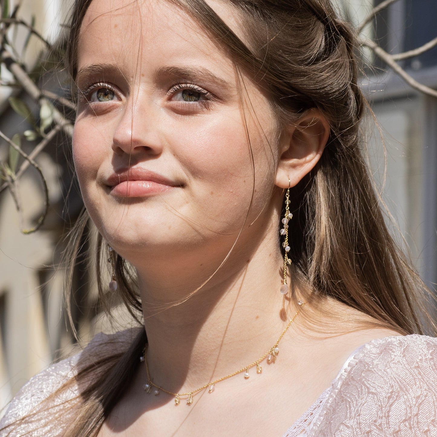 These long, yellow and pink gemstone earrings are inspired by the character Penelope from Bridgerton. Usually dressed in yellow, Penelope's cheerfulness hides depths of creativity, knowledge and resourcefulness.