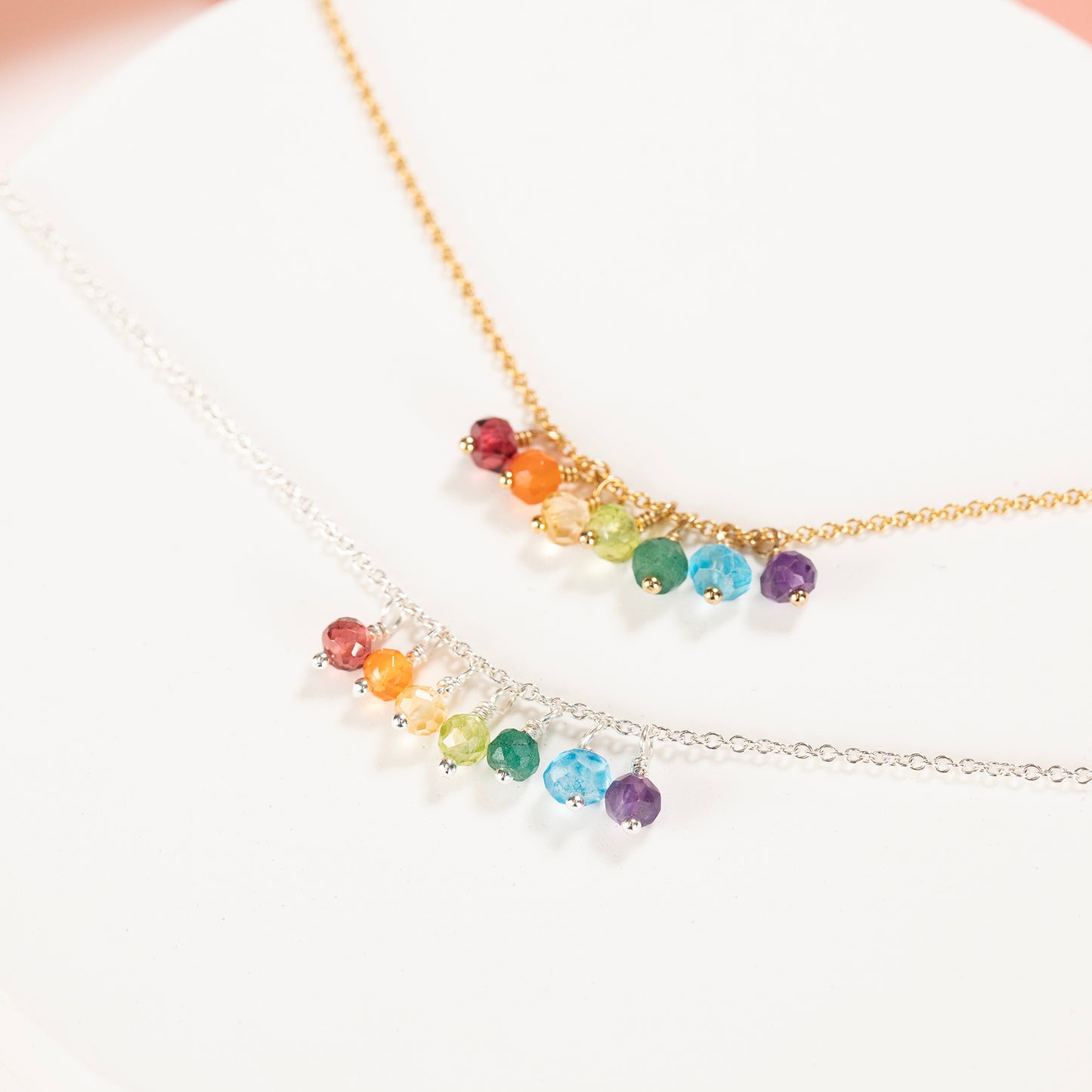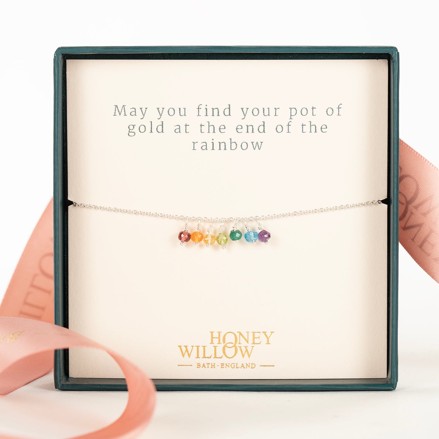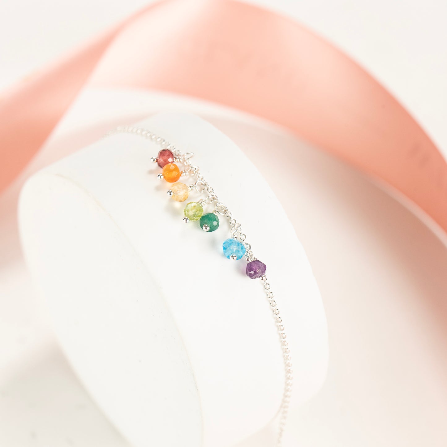 This delicate bracelet is handmade with seven gemstones to form a rainbow.