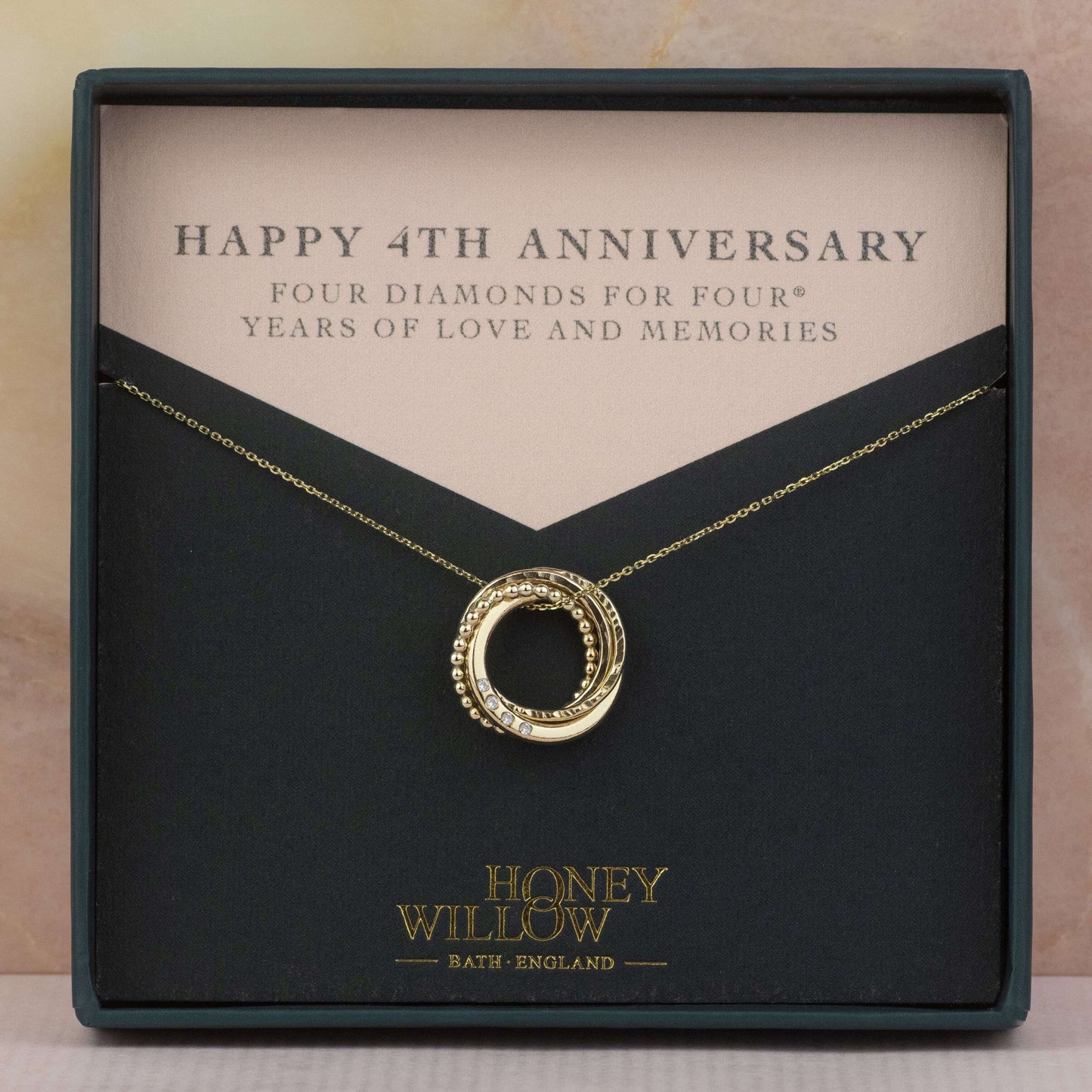 Circles symbolise infinite love, strength, protection and unity. We make her pendant with four linked circles, giving each link a different texture to represent each unique year, and add four tiny conflict-free diamonds: a diamond for each year of love and memories.