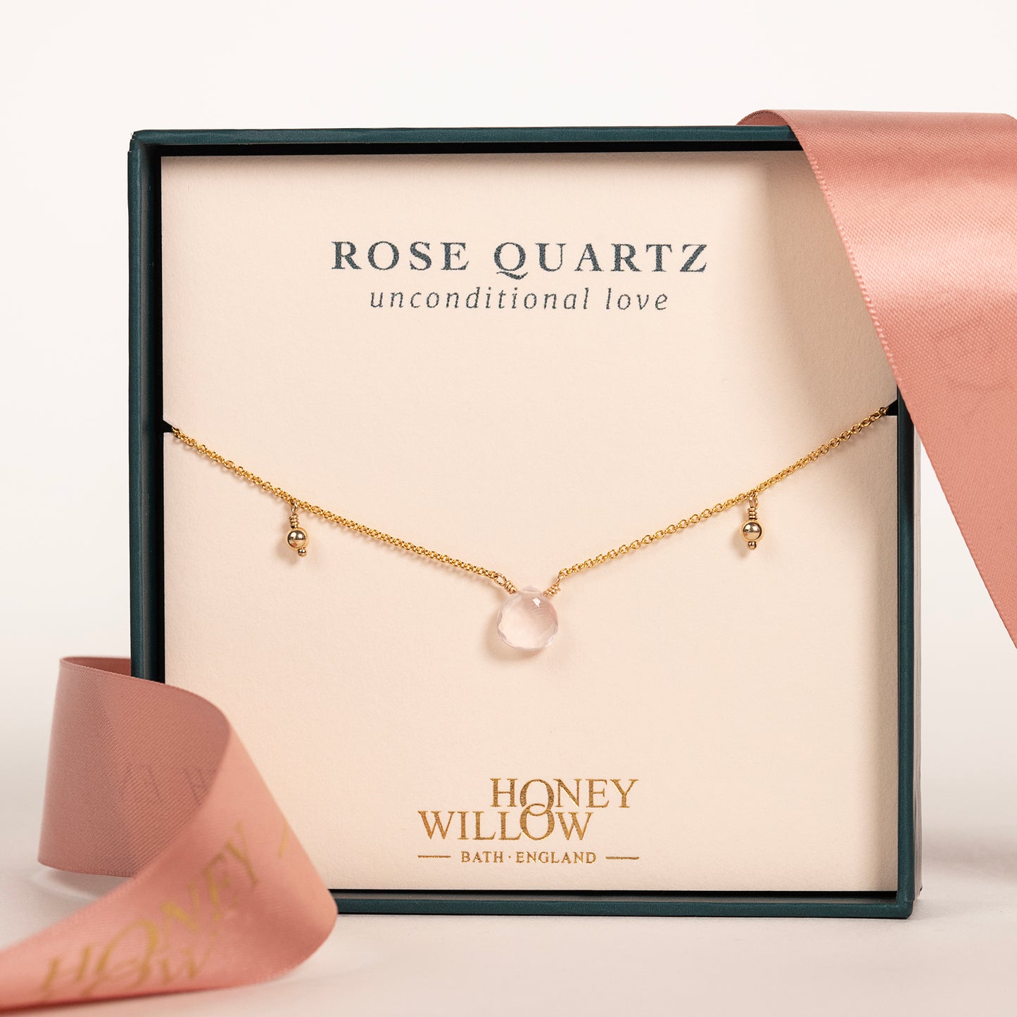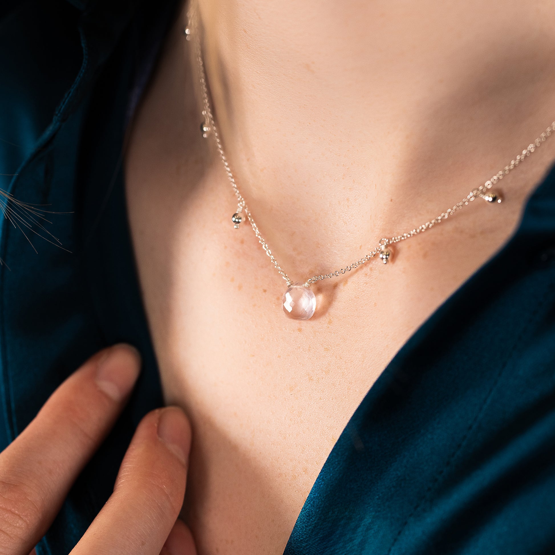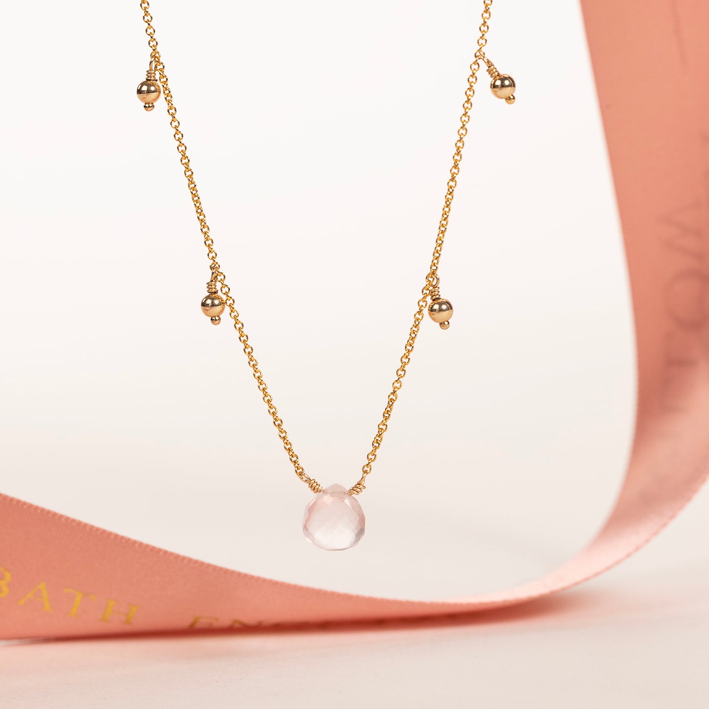 Give her a meaningful gift that celebrates and inspires her. This gemstone necklace is handmade with a rose quartz stone, which symbolises unconditional love. Either silver or 14k gold-fill balls continue around the rest of the necklace.