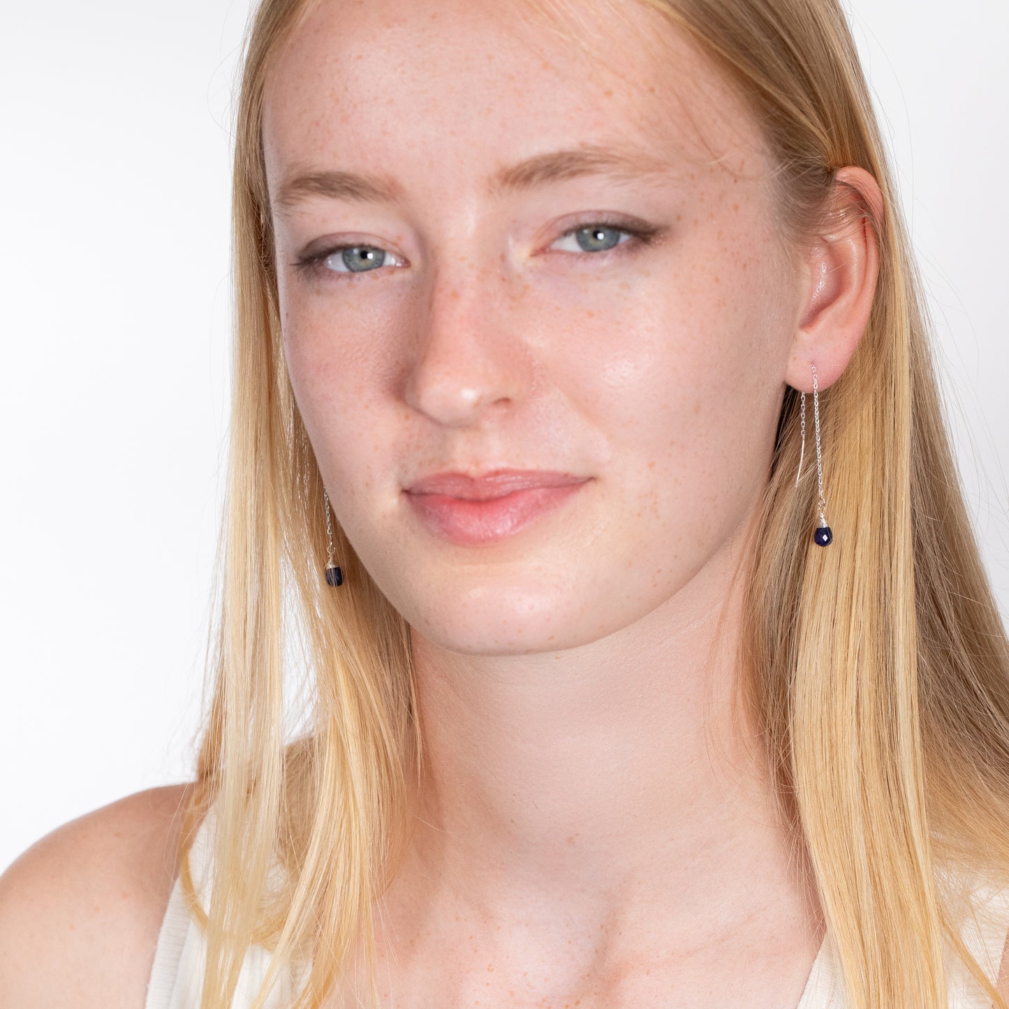 The earrings are made with fine, delicate chain which is threaded through a pierced ear and adjusted so that the birthstone sits where the wearer prefers.