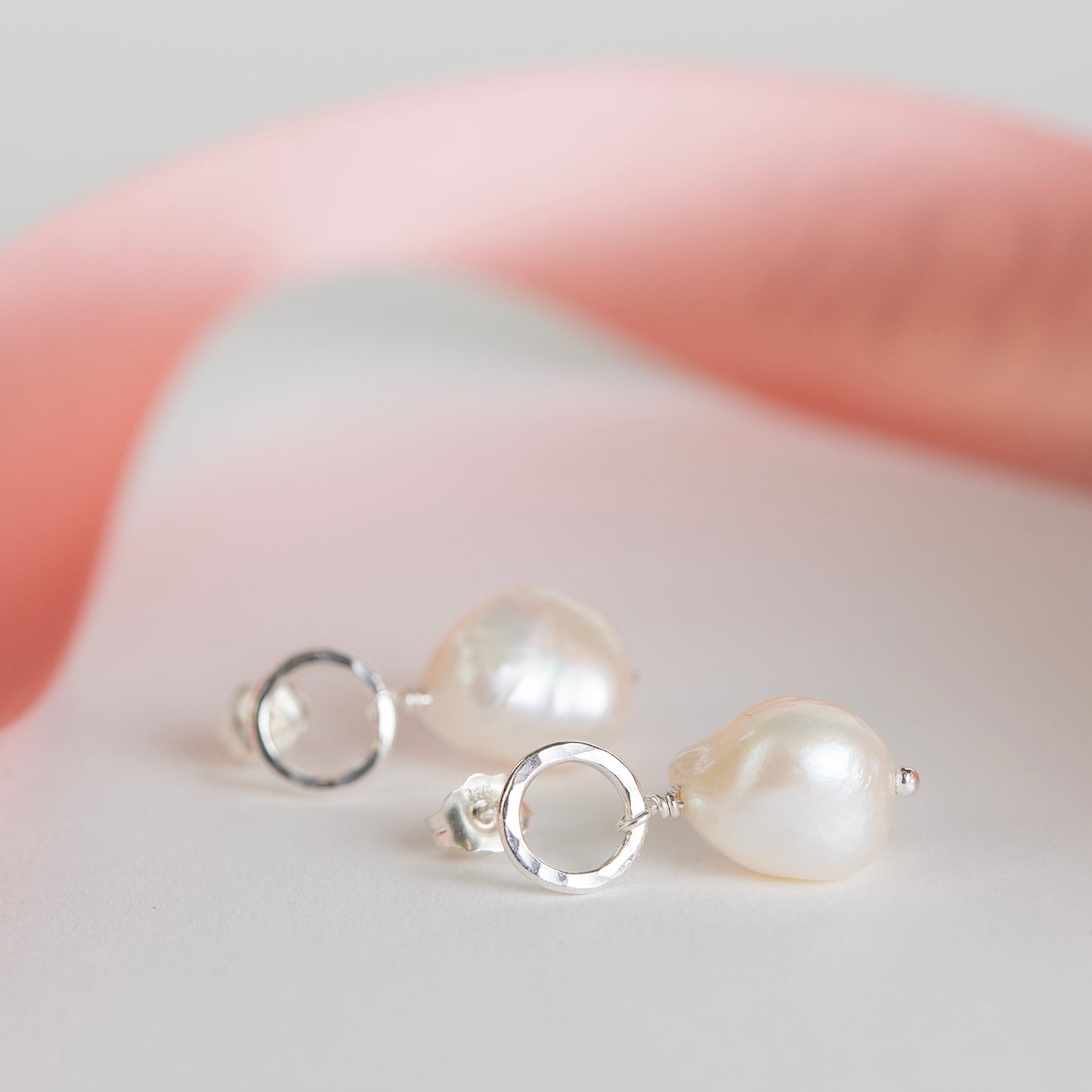 These silver halo earrings are handmade with irregular baroque pearl drops.