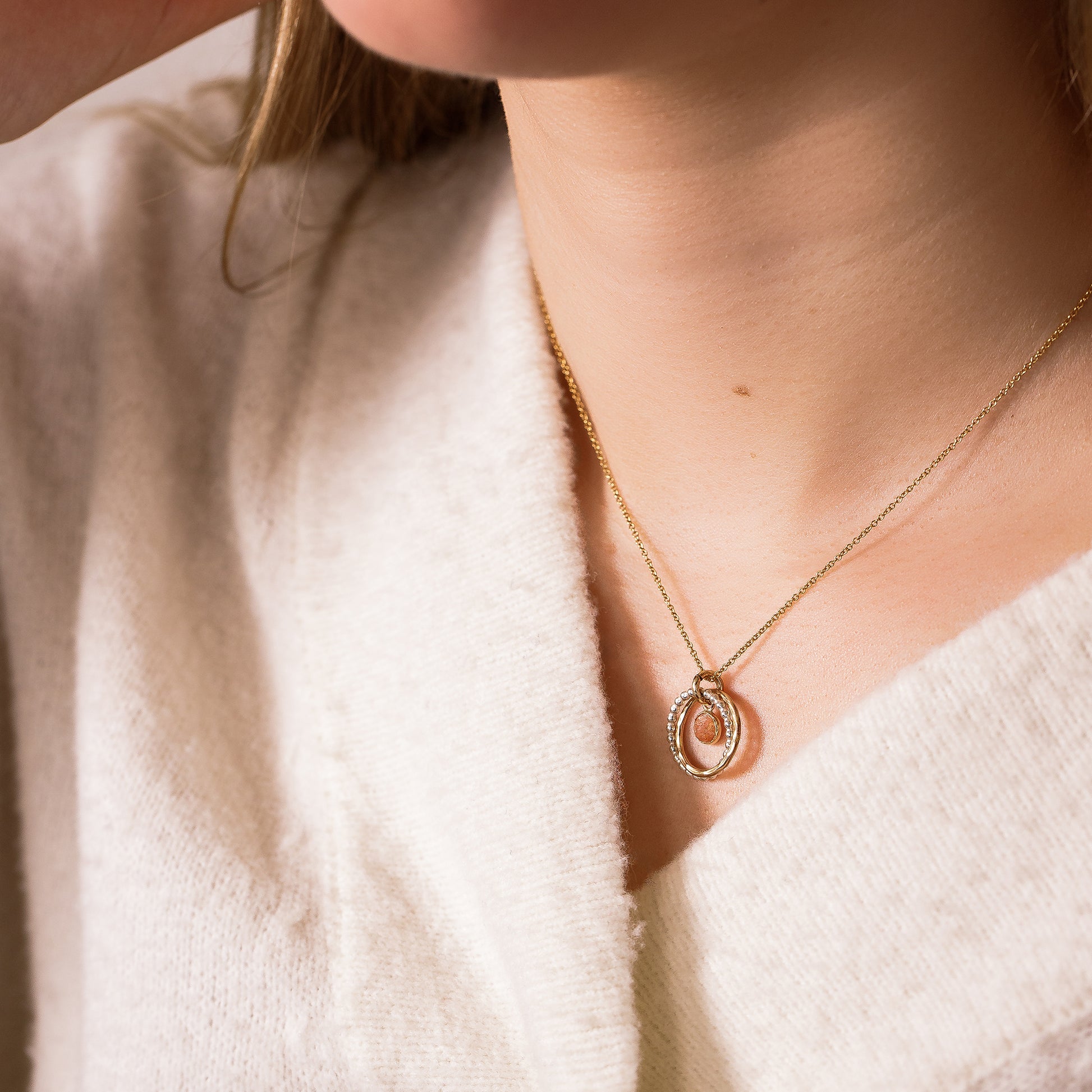 Circles symbolise infinite love, strength and protection. Two linked circles, one silver, one gold-fill, encircle a sunstone.