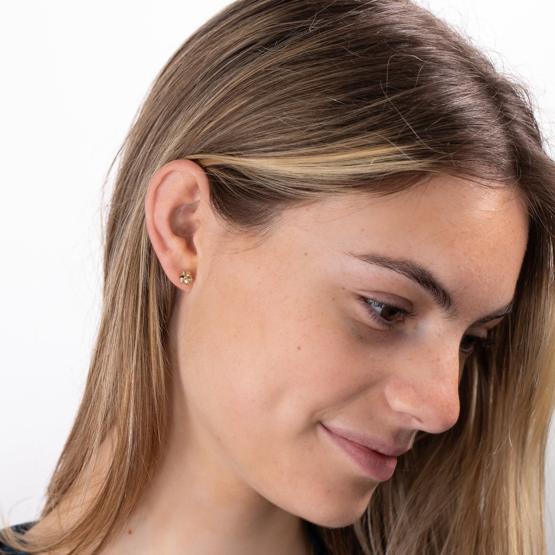These dainty violet flower stud earrings are made with recycled 9kt gold.